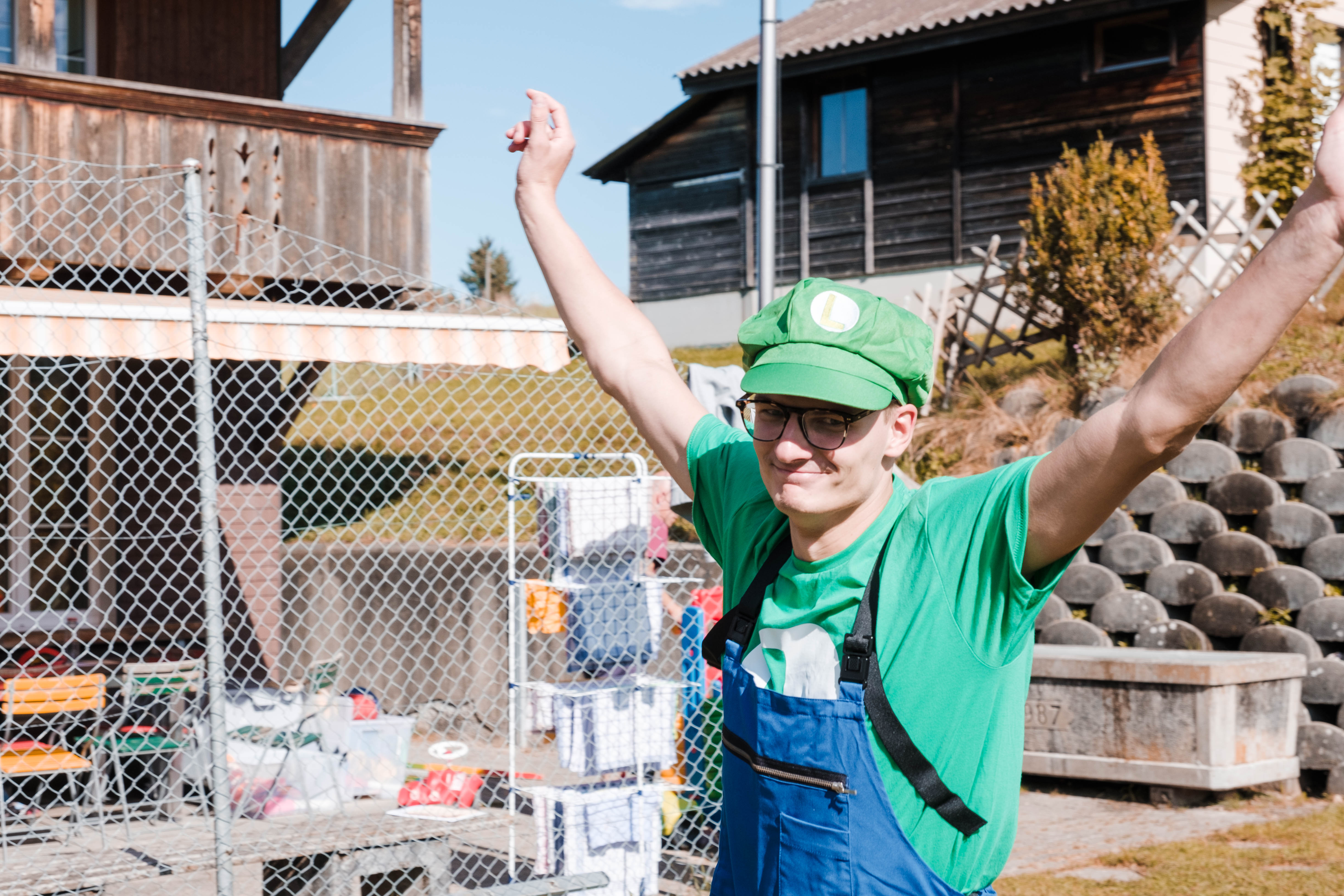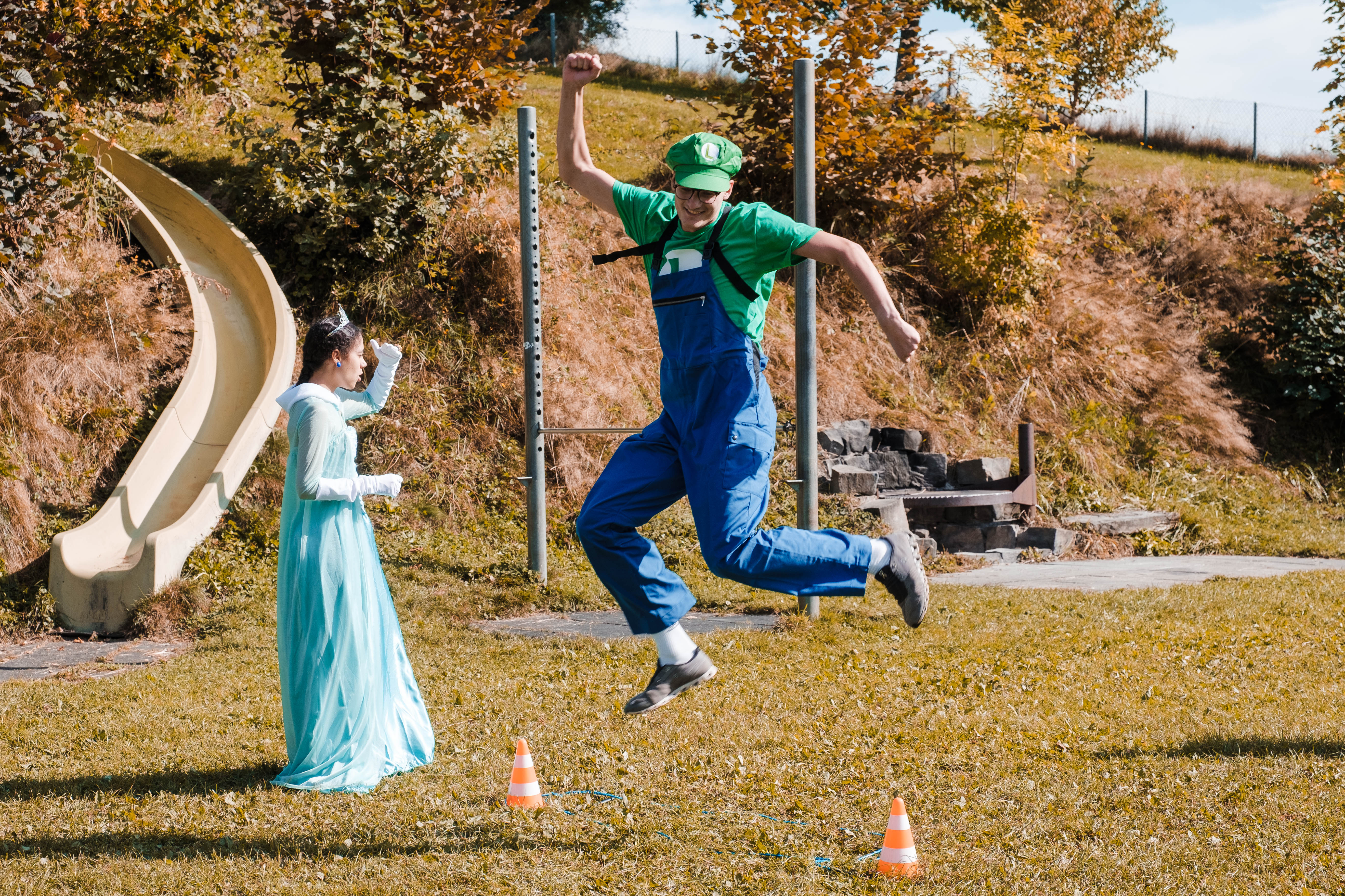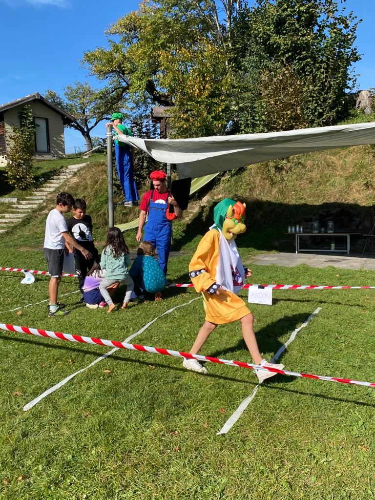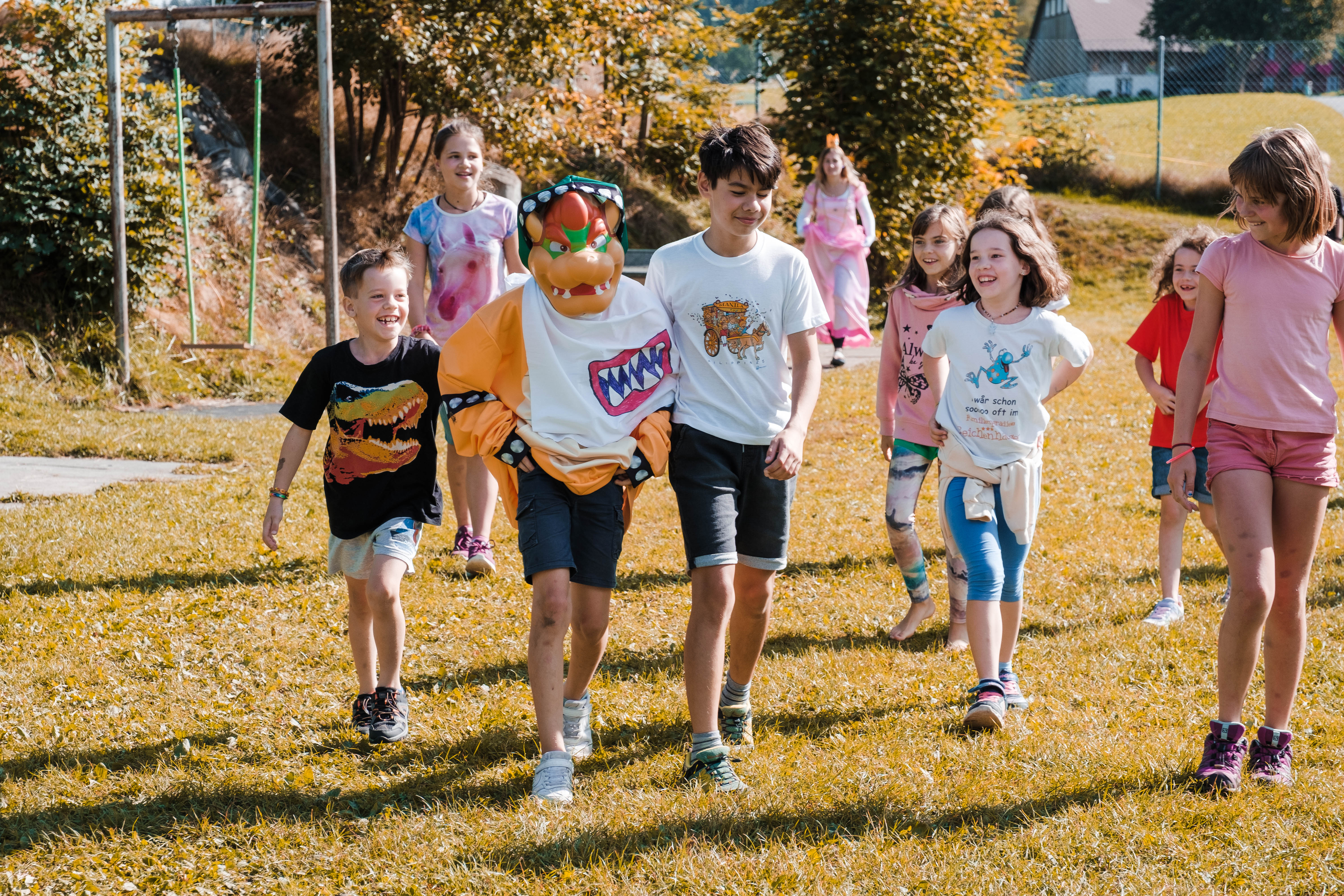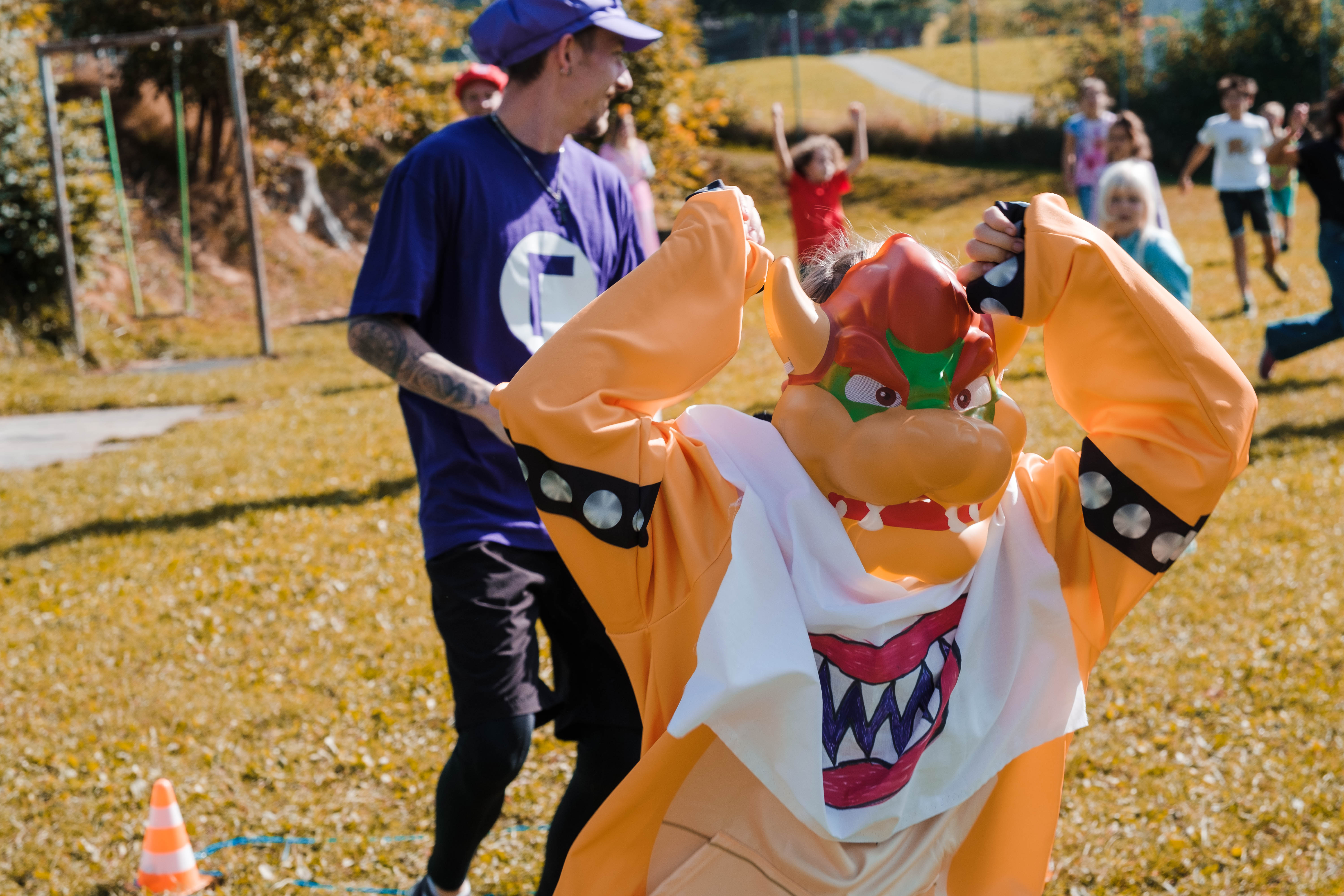 Am Morgen war jedoch erstmal freies Spiel angesagt. Die Kinder durften die Zeit für sich nutzen, einige übten bereits fleissig für den bunten Abend. Zum Z'mittag gab es feine Lasagne; das perfekte Gericht für den bevorstehenden Endkampf. Dieser fand wenige Stunden später auf der grossen Spielwiese statt. Es handelt sich um ein XXL Monopoly Geländespiel, jedoch in abgeänderter Form. Während die vier Teams der Kinder klassisch Strassen kaufen und vervollständigen können, kann Bowser diese Felder verändern. So erscheint auf einem Feld plötzlich die fleischfressende Pflanze oder ein Kettenhund, welche den Kindern die Münzen stehlen. Oder ein Team muss eine ganze Runde für Bowser spielen, und die gesamten Einnahmen an ihn überreichen. Schnell verstanden die Kids, dass sie zwar in vier Gruppen eingeteilt wurden, allerdings zusammenspielen und verhandeln müssen, um den gemeinsamen Feind Bowser zu besiegen. Indem die Teams schlau verhandelten und gezielt ihre Häuser bauten, konnte der Münzbestand von Bowser immer schneller abgebaut werden. Nach einer Stunde war dieser völlig bankrott und musste sich geschlagen geben. Der Jubel war gross und die gesamten Super Mario Figuren waren unendlich dankbar.
