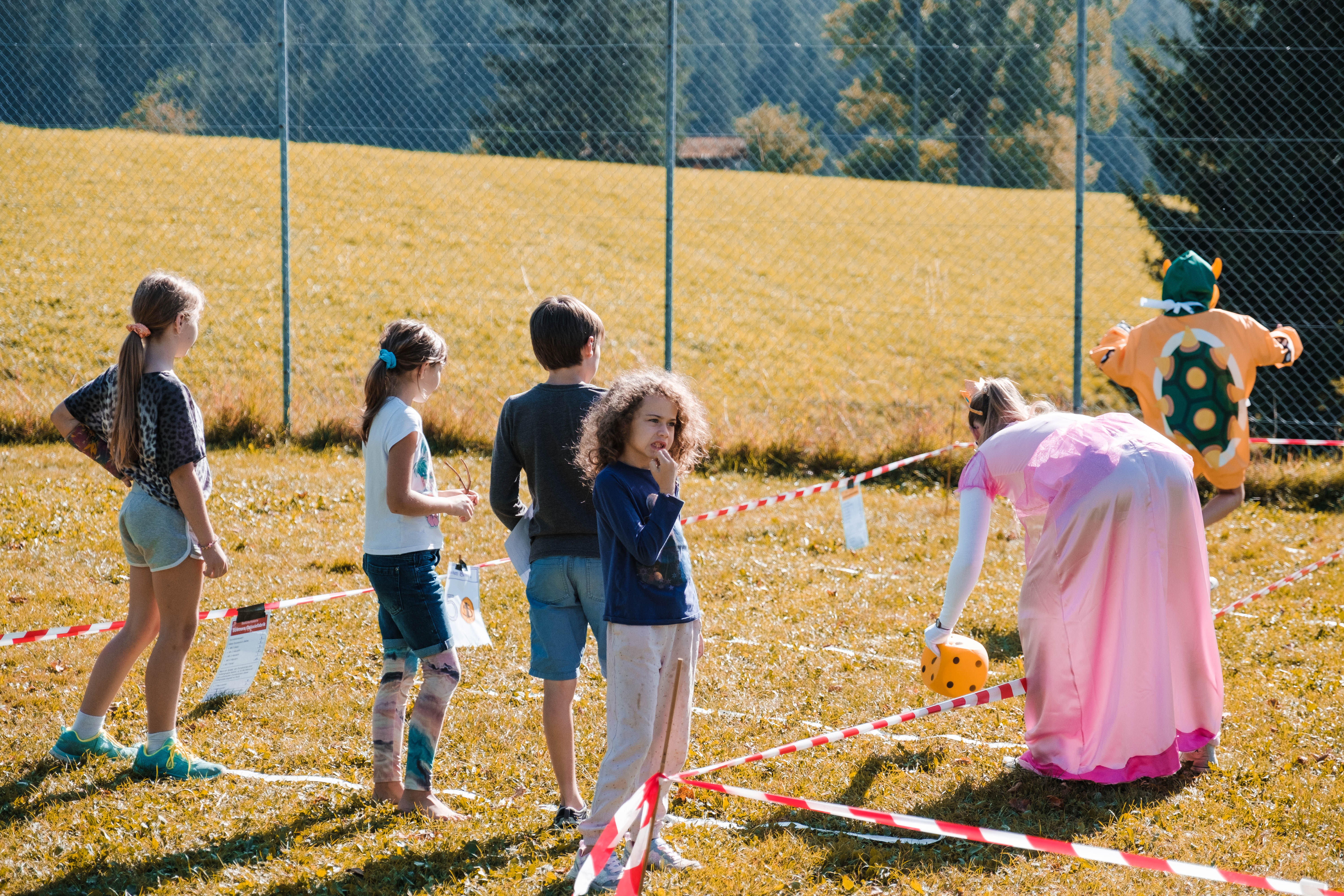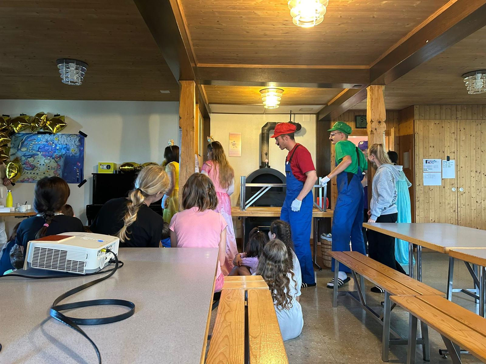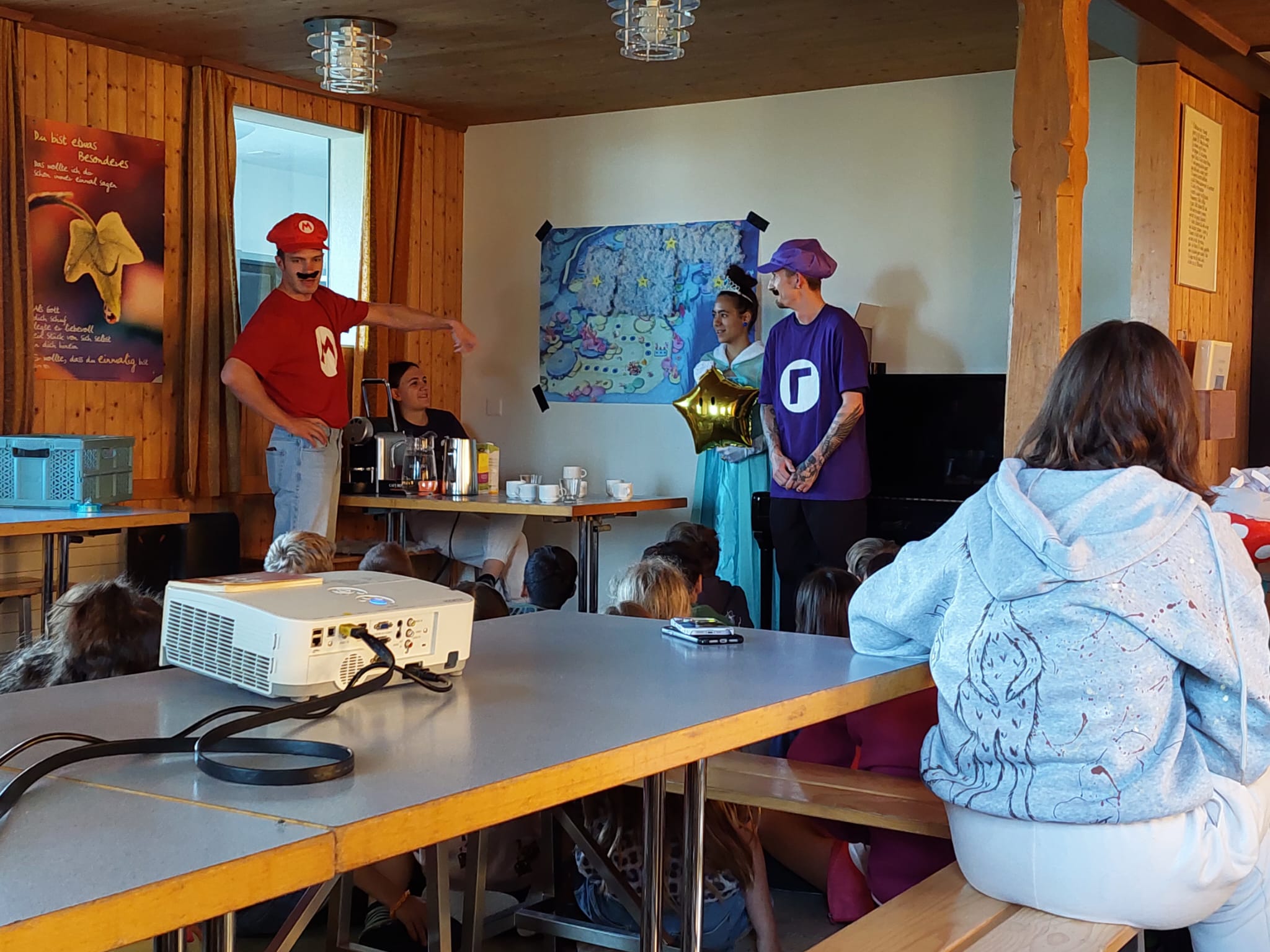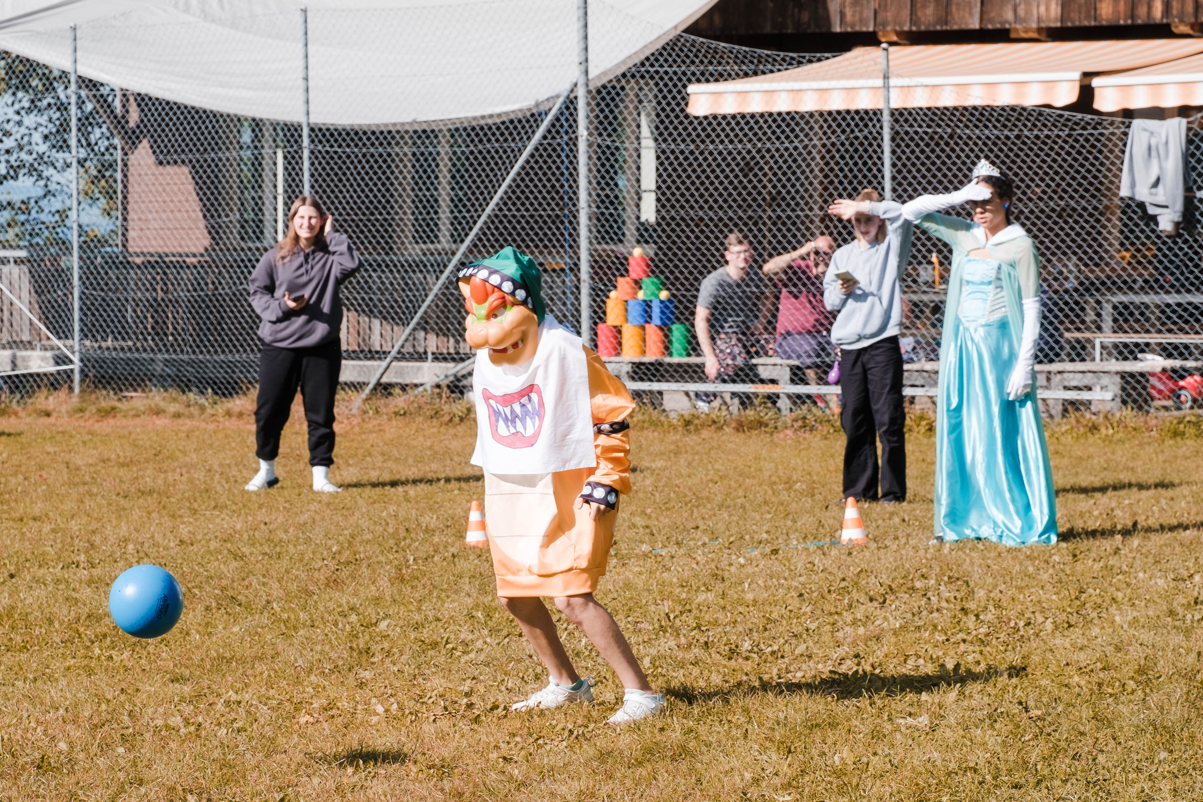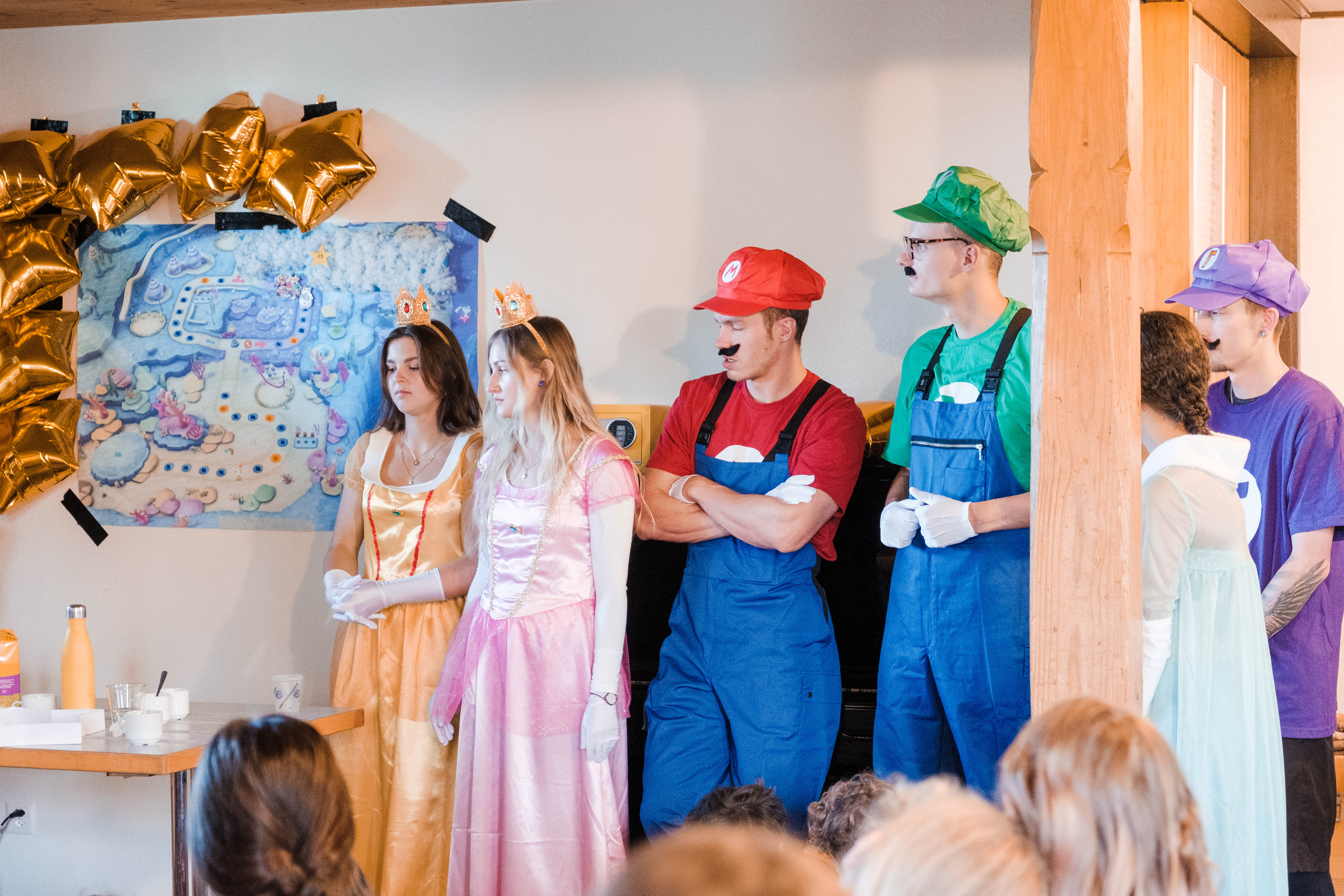 Am Morgen war jedoch erstmal freies Spiel angesagt. Die Kinder durften die Zeit für sich nutzen, einige übten bereits fleissig für den bunten Abend. Zum Z'mittag gab es feine Lasagne; das perfekte Gericht für den bevorstehenden Endkampf. Dieser fand wenige Stunden später auf der grossen Spielwiese statt. Es handelt sich um ein XXL Monopoly Geländespiel, jedoch in abgeänderter Form. Während die vier Teams der Kinder klassisch Strassen kaufen und vervollständigen können, kann Bowser diese Felder verändern. So erscheint auf einem Feld plötzlich die fleischfressende Pflanze oder ein Kettenhund, welche den Kindern die Münzen stehlen. Oder ein Team muss eine ganze Runde für Bowser spielen, und die gesamten Einnahmen an ihn überreichen. Schnell verstanden die Kids, dass sie zwar in vier Gruppen eingeteilt wurden, allerdings zusammenspielen und verhandeln müssen, um den gemeinsamen Feind Bowser zu besiegen. Indem die Teams schlau verhandelten und gezielt ihre Häuser bauten, konnte der Münzbestand von Bowser immer schneller abgebaut werden. Nach einer Stunde war dieser völlig bankrott und musste sich geschlagen geben. Der Jubel war gross und die gesamten Super Mario Figuren waren unendlich dankbar.
