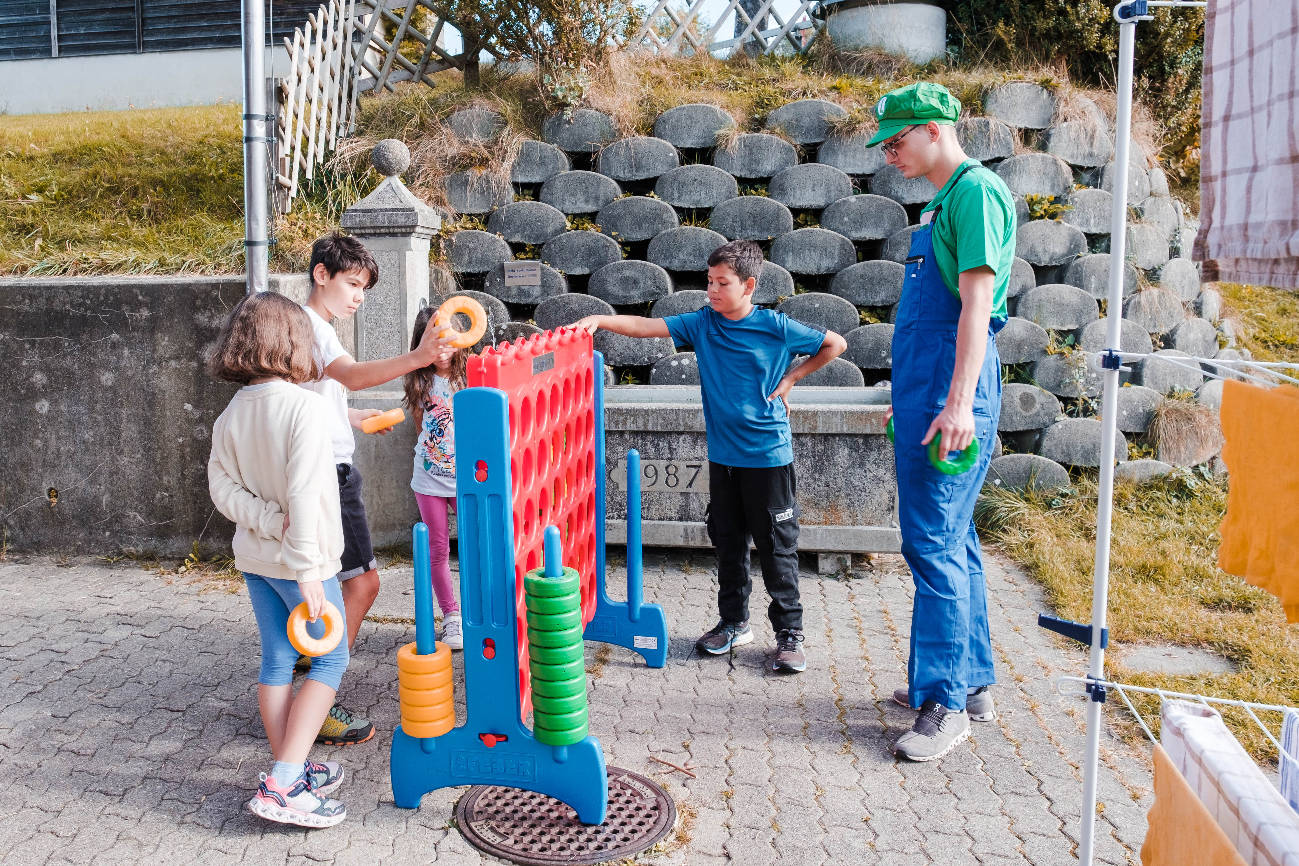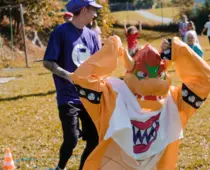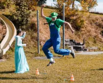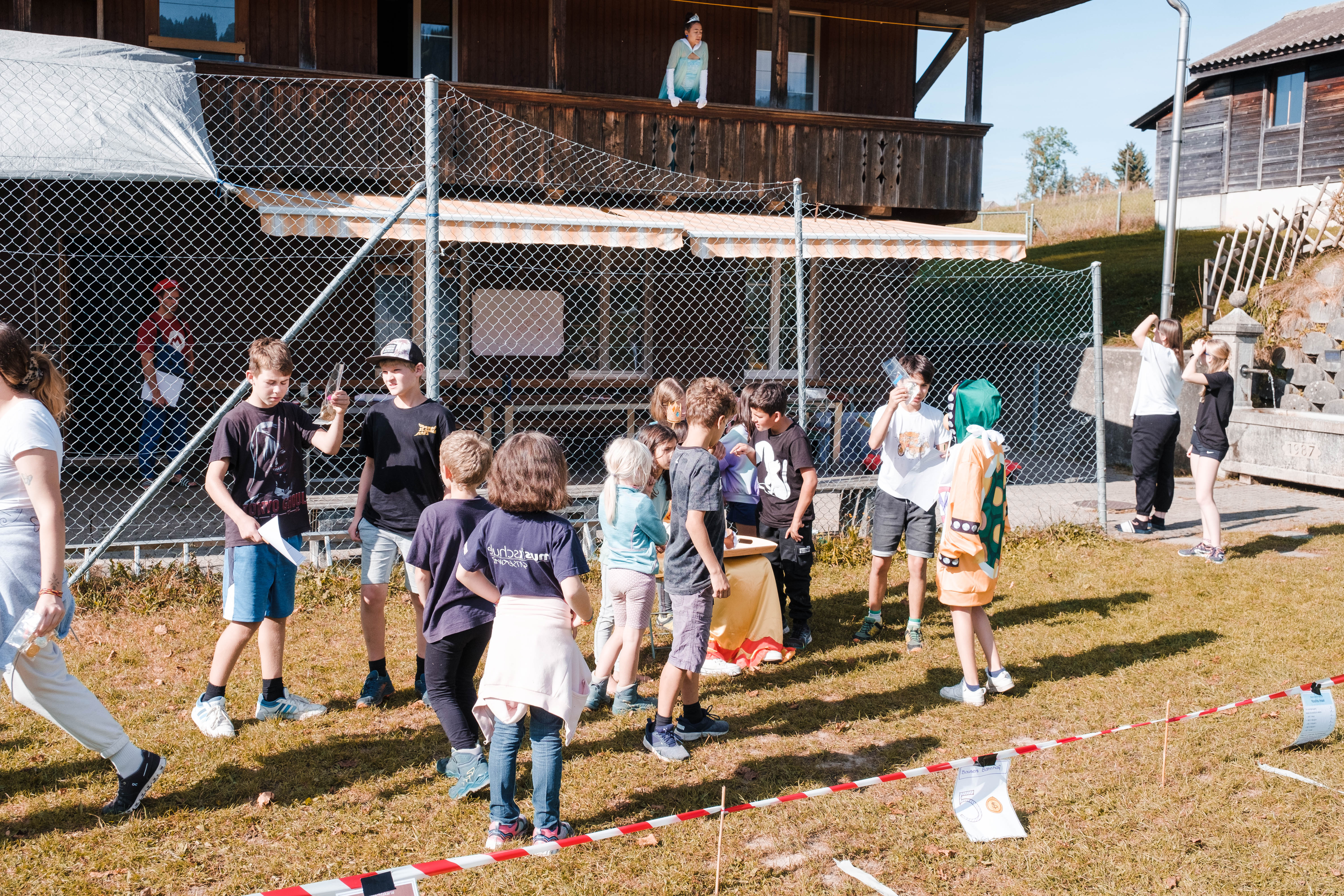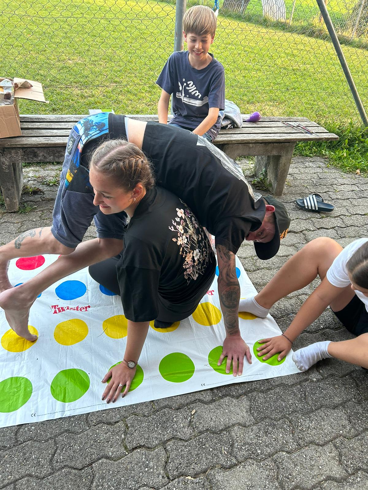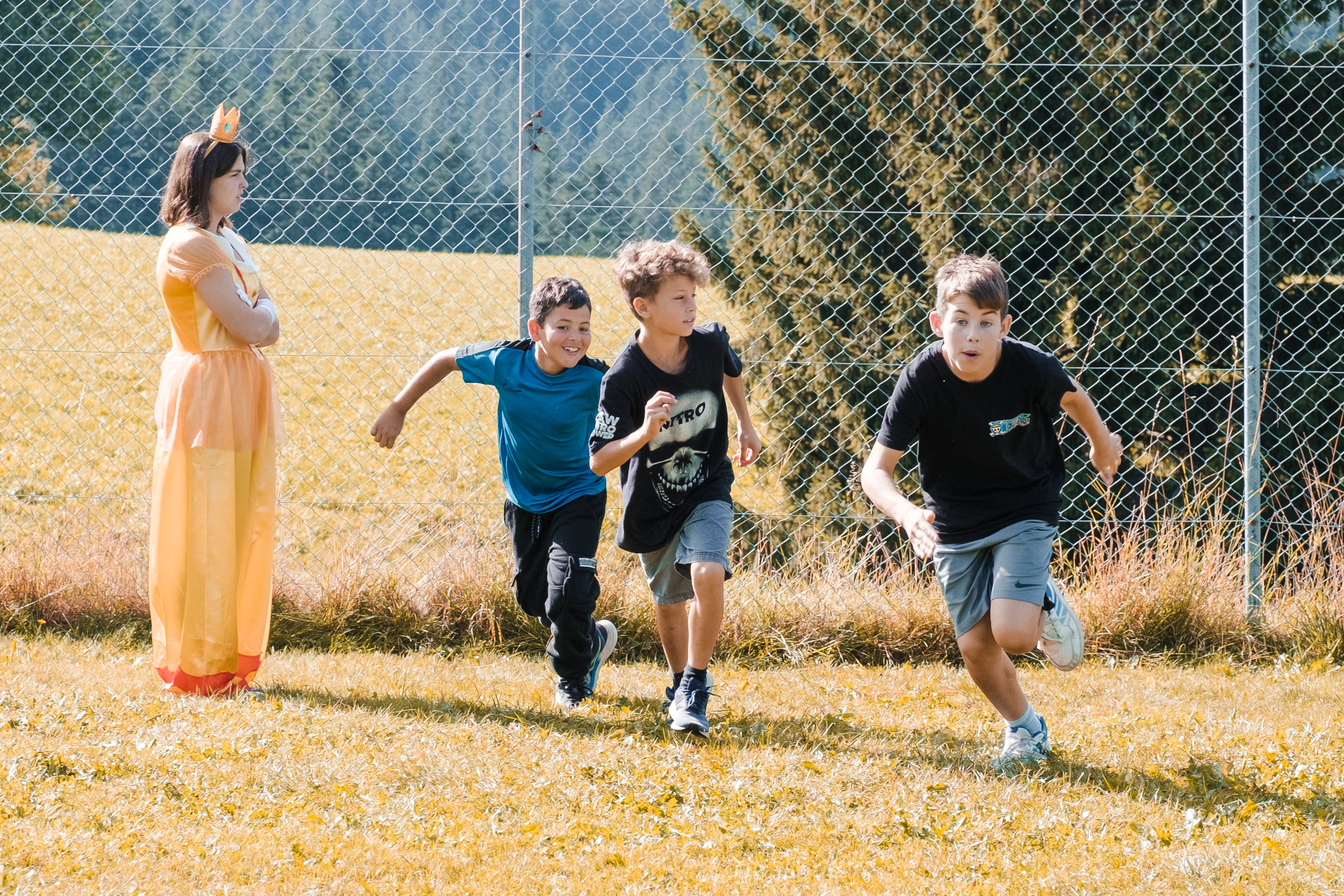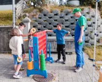 Am Morgen war jedoch erstmal freies Spiel angesagt. Die Kinder durften die Zeit für sich nutzen, einige übten bereits fleissig für den bunten Abend. Zum Z'mittag gab es feine Lasagne; das perfekte Gericht für den bevorstehenden Endkampf. Dieser fand wenige Stunden später auf der grossen Spielwiese statt. Es handelt sich um ein XXL Monopoly Geländespiel, jedoch in abgeänderter Form. Während die vier Teams der Kinder klassisch Strassen kaufen und vervollständigen können, kann Bowser diese Felder verändern. So erscheint auf einem Feld plötzlich die fleischfressende Pflanze oder ein Kettenhund, welche den Kindern die Münzen stehlen. Oder ein Team muss eine ganze Runde für Bowser spielen, und die gesamten Einnahmen an ihn überreichen. Schnell verstanden die Kids, dass sie zwar in vier Gruppen eingeteilt wurden, allerdings zusammenspielen und verhandeln müssen, um den gemeinsamen Feind Bowser zu besiegen. Indem die Teams schlau verhandelten und gezielt ihre Häuser bauten, konnte der Münzbestand von Bowser immer schneller abgebaut werden. Nach einer Stunde war dieser völlig bankrott und musste sich geschlagen geben. Der Jubel war gross und die gesamten Super Mario Figuren waren unendlich dankbar.