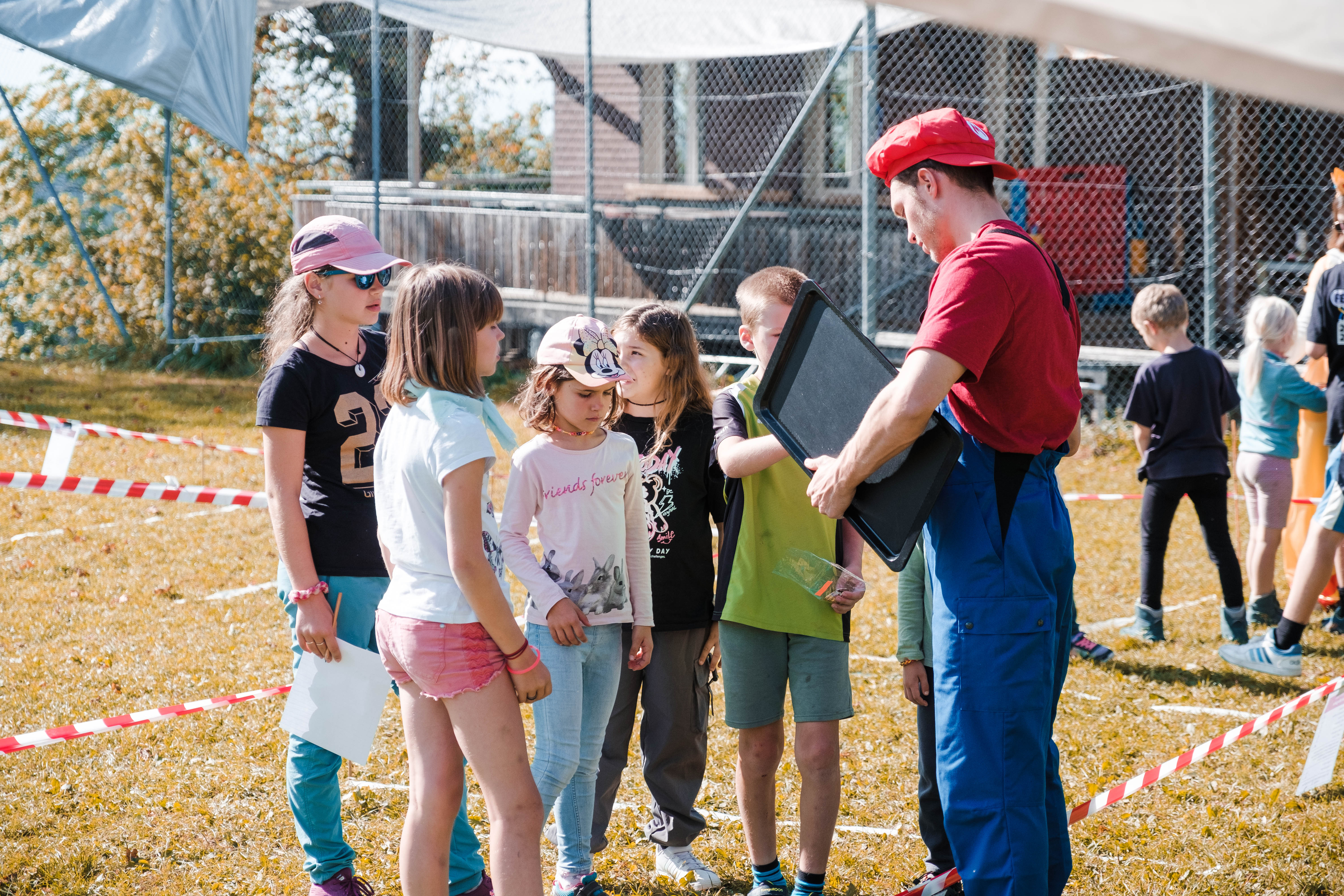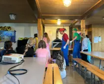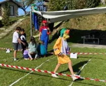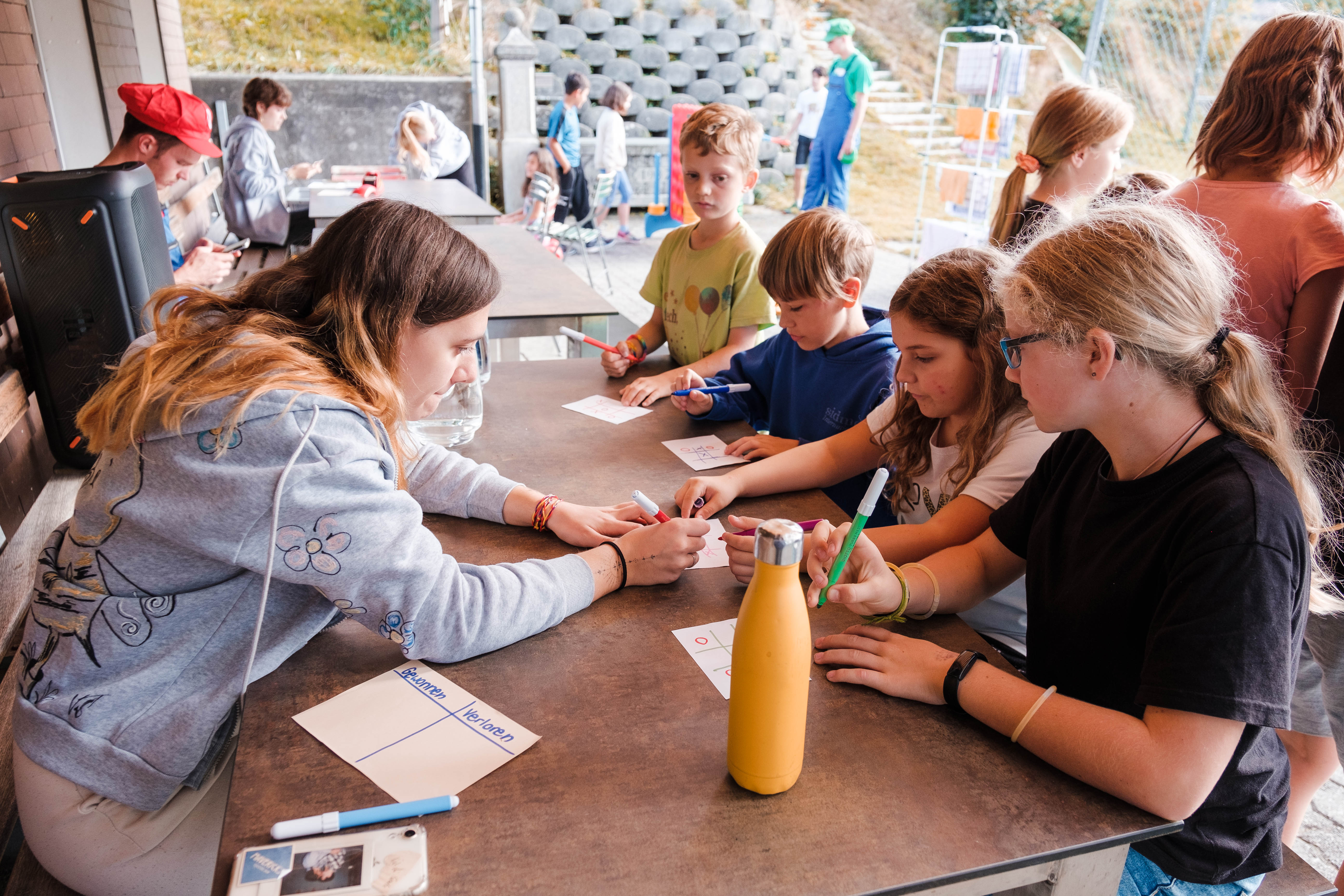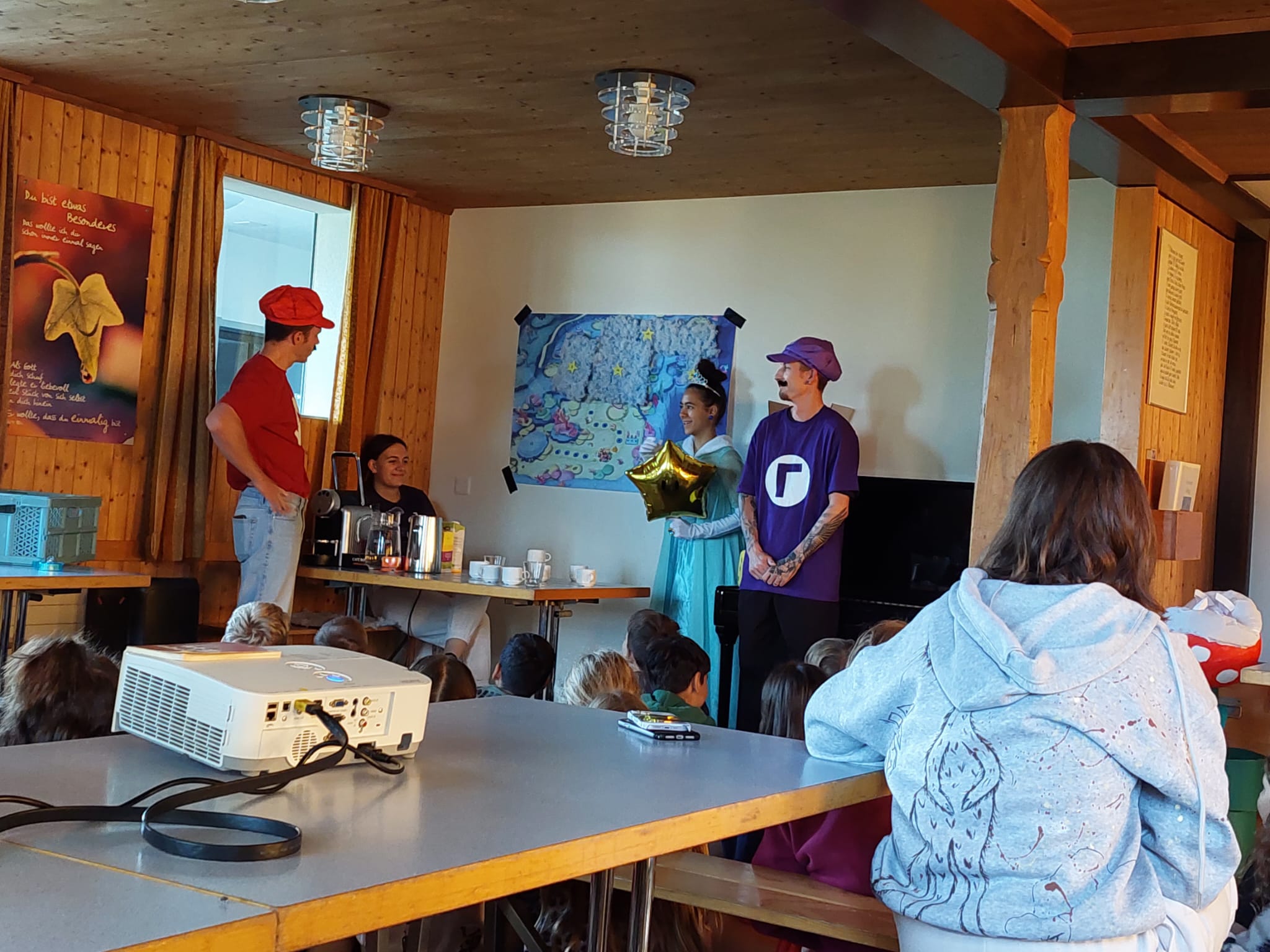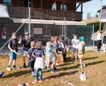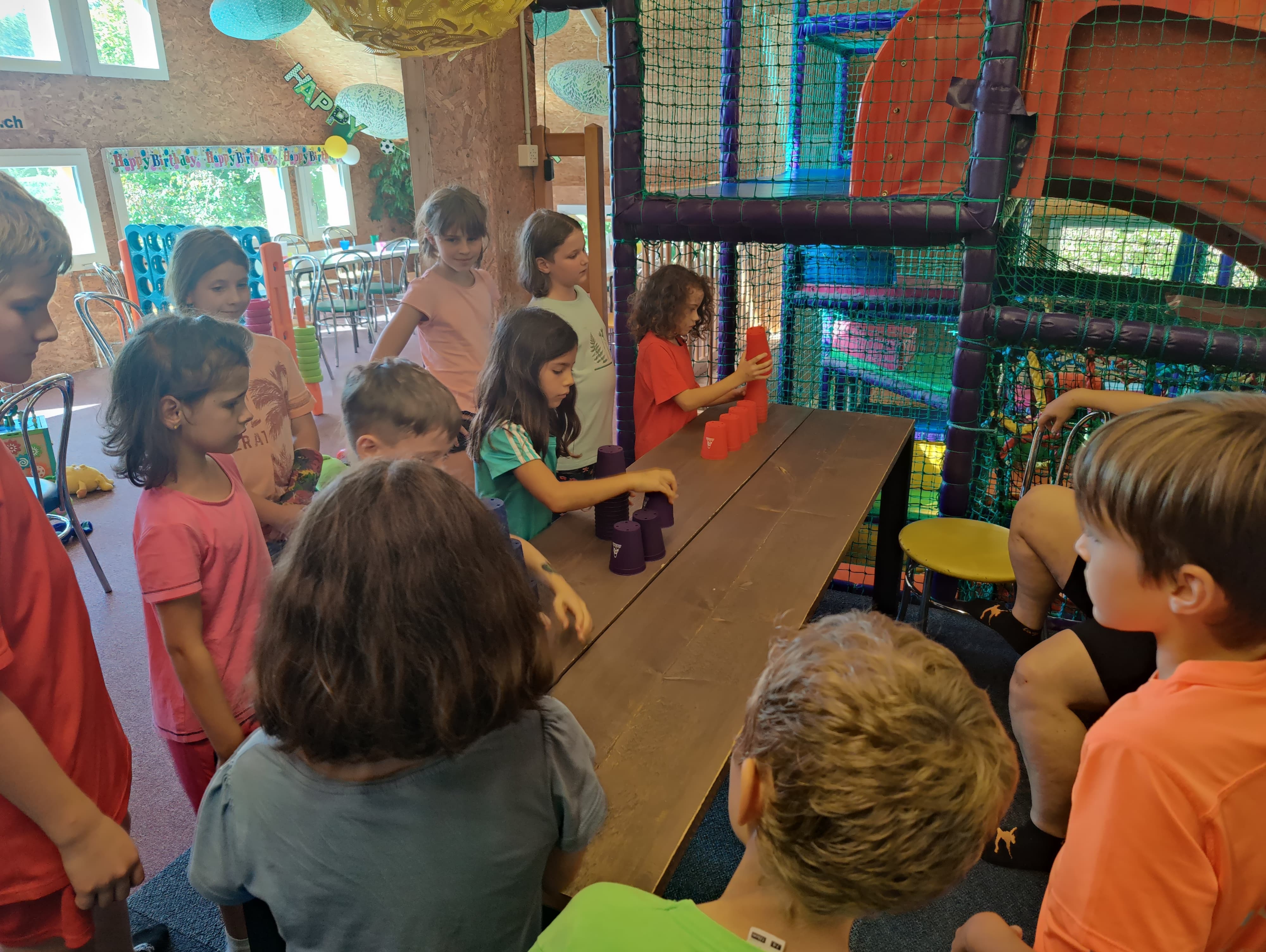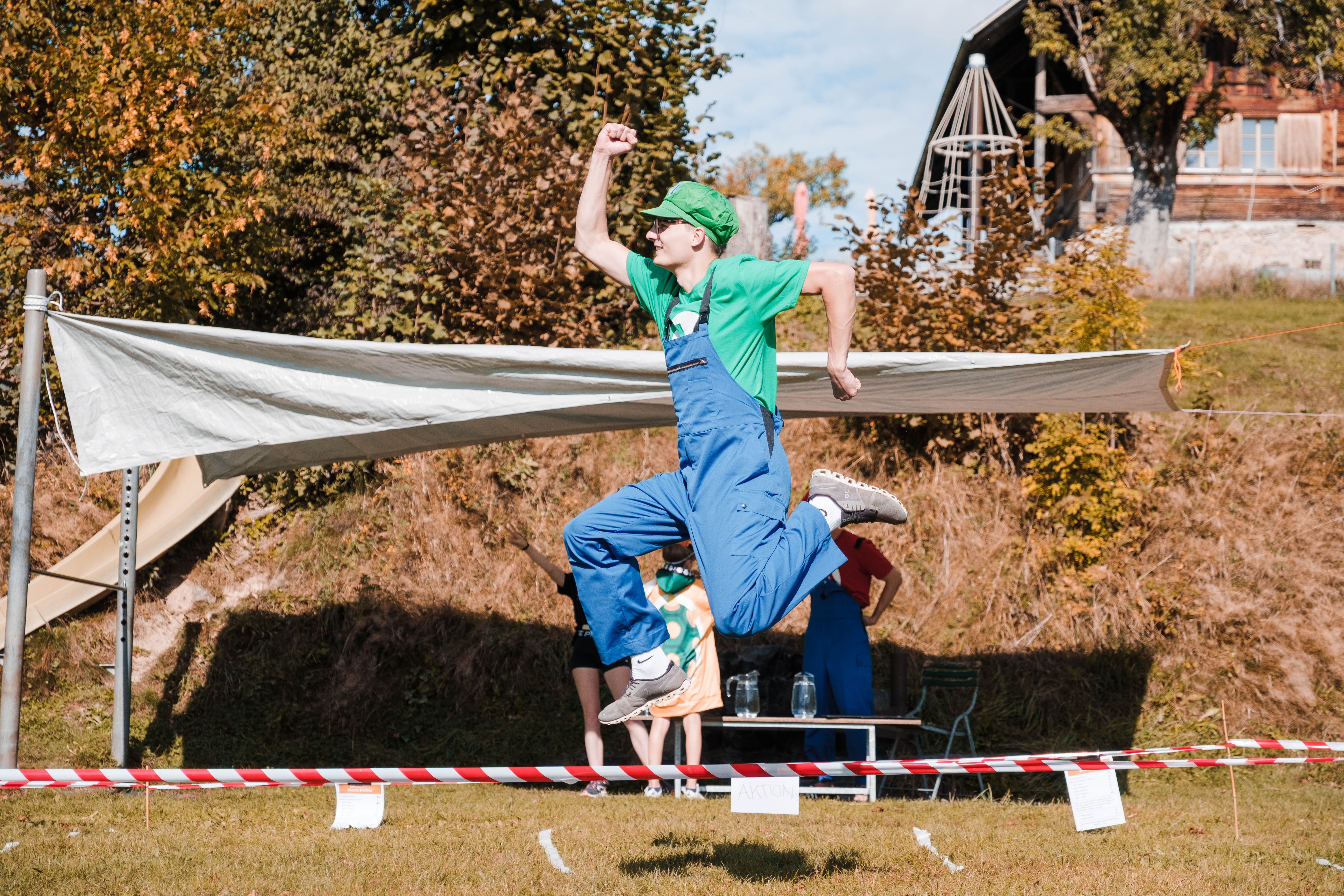 Am Morgen war jedoch erstmal freies Spiel angesagt. Die Kinder durften die Zeit für sich nutzen, einige übten bereits fleissig für den bunten Abend. Zum Z'mittag gab es feine Lasagne; das perfekte Gericht für den bevorstehenden Endkampf. Dieser fand wenige Stunden später auf der grossen Spielwiese statt. Es handelt sich um ein XXL Monopoly Geländespiel, jedoch in abgeänderter Form. Während die vier Teams der Kinder klassisch Strassen kaufen und vervollständigen können, kann Bowser diese Felder verändern. So erscheint auf einem Feld plötzlich die fleischfressende Pflanze oder ein Kettenhund, welche den Kindern die Münzen stehlen. Oder ein Team muss eine ganze Runde für Bowser spielen, und die gesamten Einnahmen an ihn überreichen. Schnell verstanden die Kids, dass sie zwar in vier Gruppen eingeteilt wurden, allerdings zusammenspielen und verhandeln müssen, um den gemeinsamen Feind Bowser zu besiegen. Indem die Teams schlau verhandelten und gezielt ihre Häuser bauten, konnte der Münzbestand von Bowser immer schneller abgebaut werden. Nach einer Stunde war dieser völlig bankrott und musste sich geschlagen geben. Der Jubel war gross und die gesamten Super Mario Figuren waren unendlich dankbar.