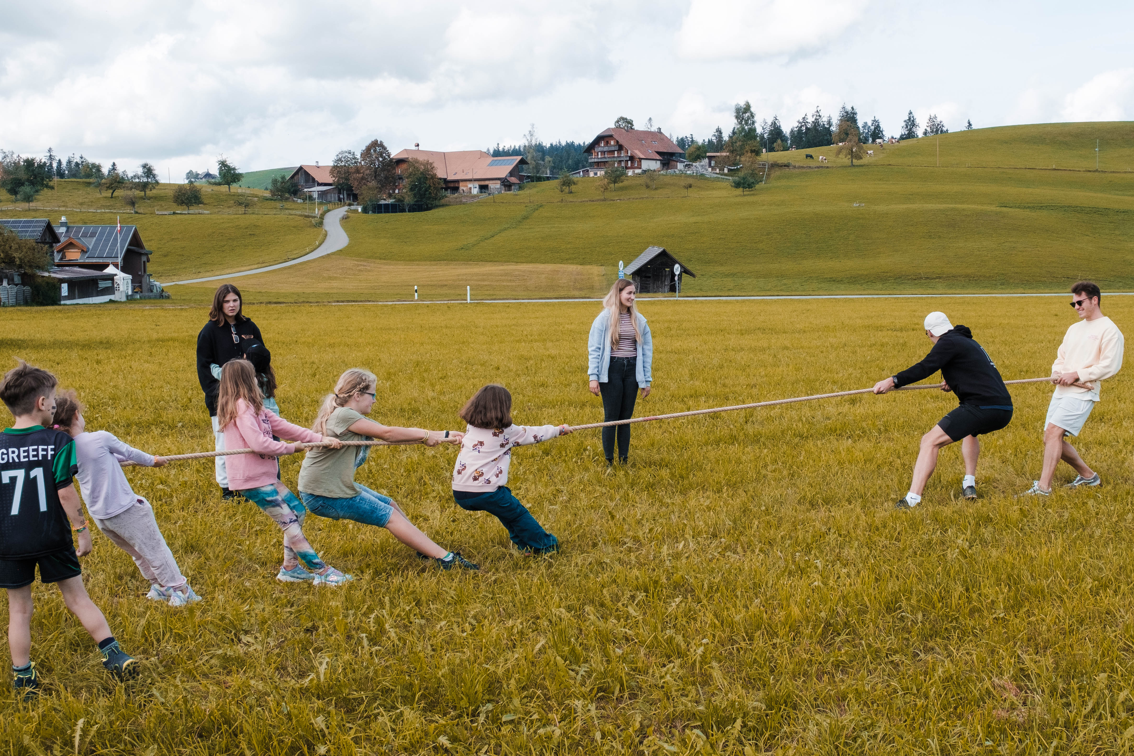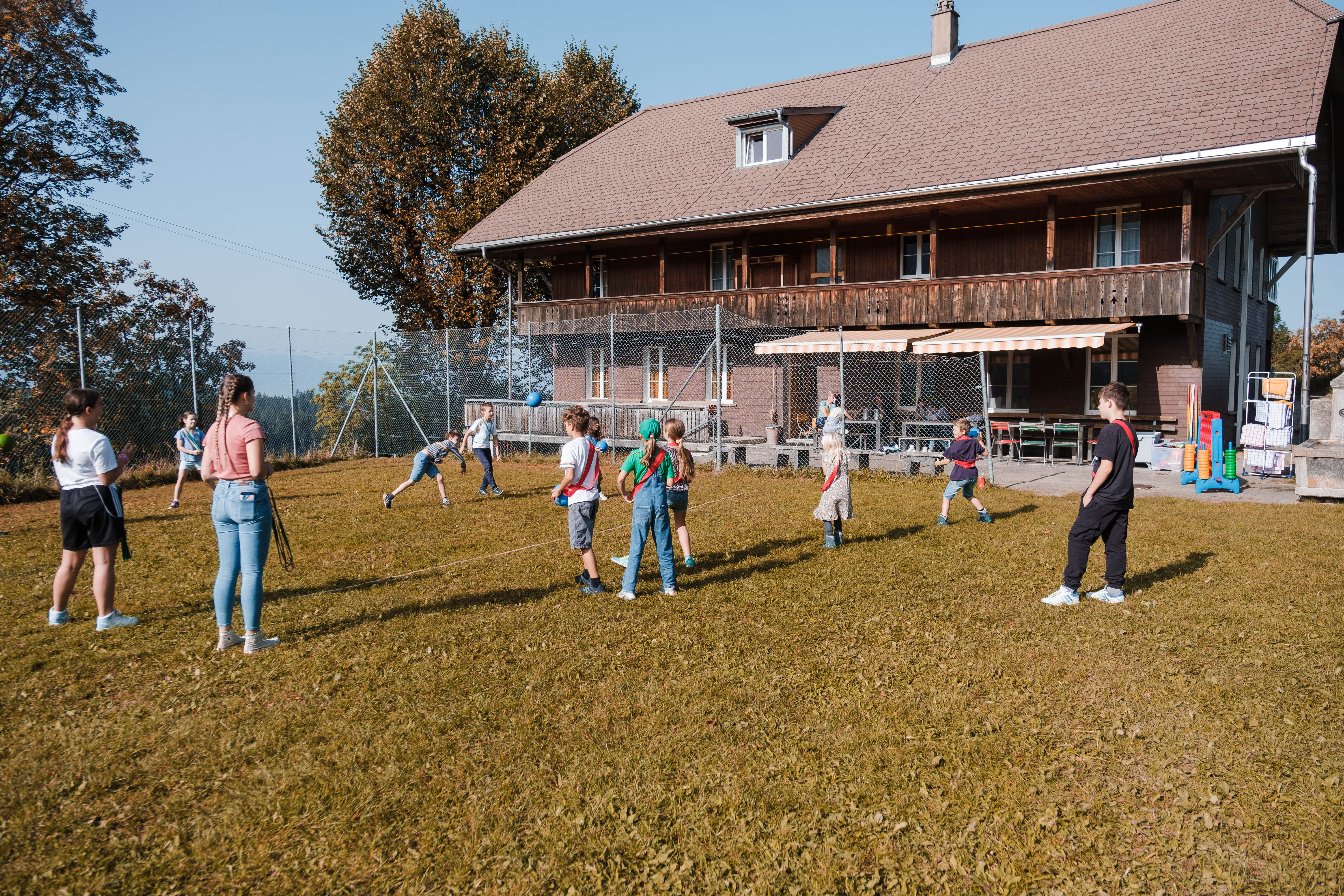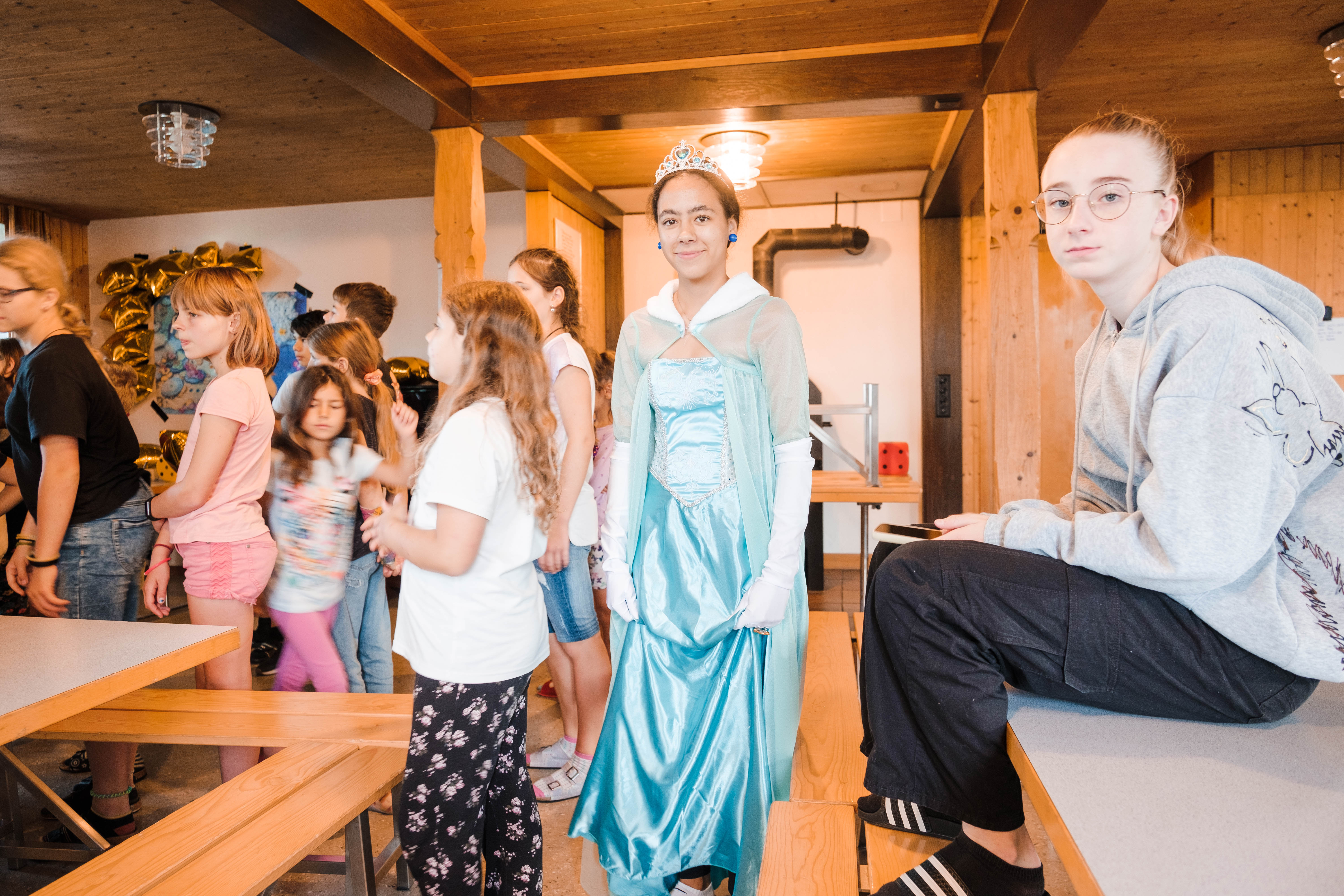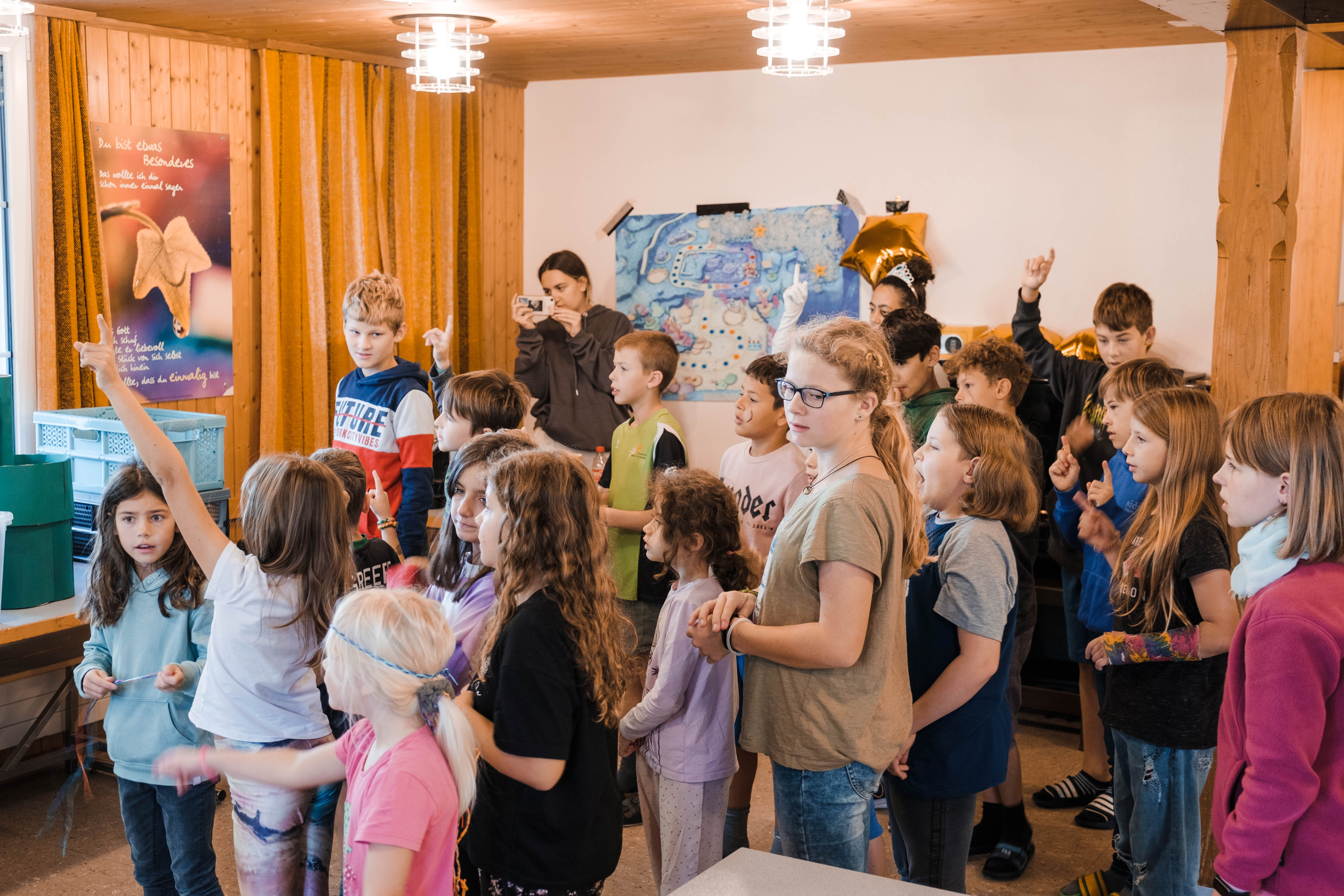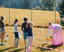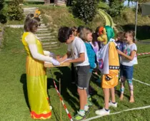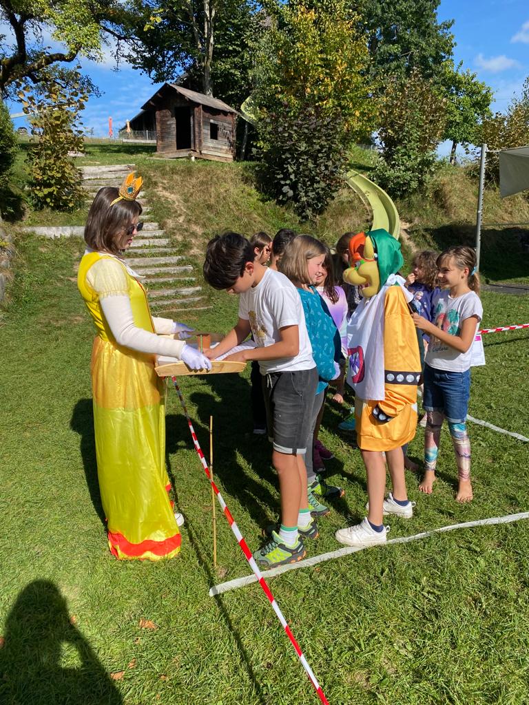 Am Morgen war jedoch erstmal freies Spiel angesagt. Die Kinder durften die Zeit für sich nutzen, einige übten bereits fleissig für den bunten Abend. Zum Z'mittag gab es feine Lasagne; das perfekte Gericht für den bevorstehenden Endkampf. Dieser fand wenige Stunden später auf der grossen Spielwiese statt. Es handelt sich um ein XXL Monopoly Geländespiel, jedoch in abgeänderter Form. Während die vier Teams der Kinder klassisch Strassen kaufen und vervollständigen können, kann Bowser diese Felder verändern. So erscheint auf einem Feld plötzlich die fleischfressende Pflanze oder ein Kettenhund, welche den Kindern die Münzen stehlen. Oder ein Team muss eine ganze Runde für Bowser spielen, und die gesamten Einnahmen an ihn überreichen. Schnell verstanden die Kids, dass sie zwar in vier Gruppen eingeteilt wurden, allerdings zusammenspielen und verhandeln müssen, um den gemeinsamen Feind Bowser zu besiegen. Indem die Teams schlau verhandelten und gezielt ihre Häuser bauten, konnte der Münzbestand von Bowser immer schneller abgebaut werden. Nach einer Stunde war dieser völlig bankrott und musste sich geschlagen geben. Der Jubel war gross und die gesamten Super Mario Figuren waren unendlich dankbar.