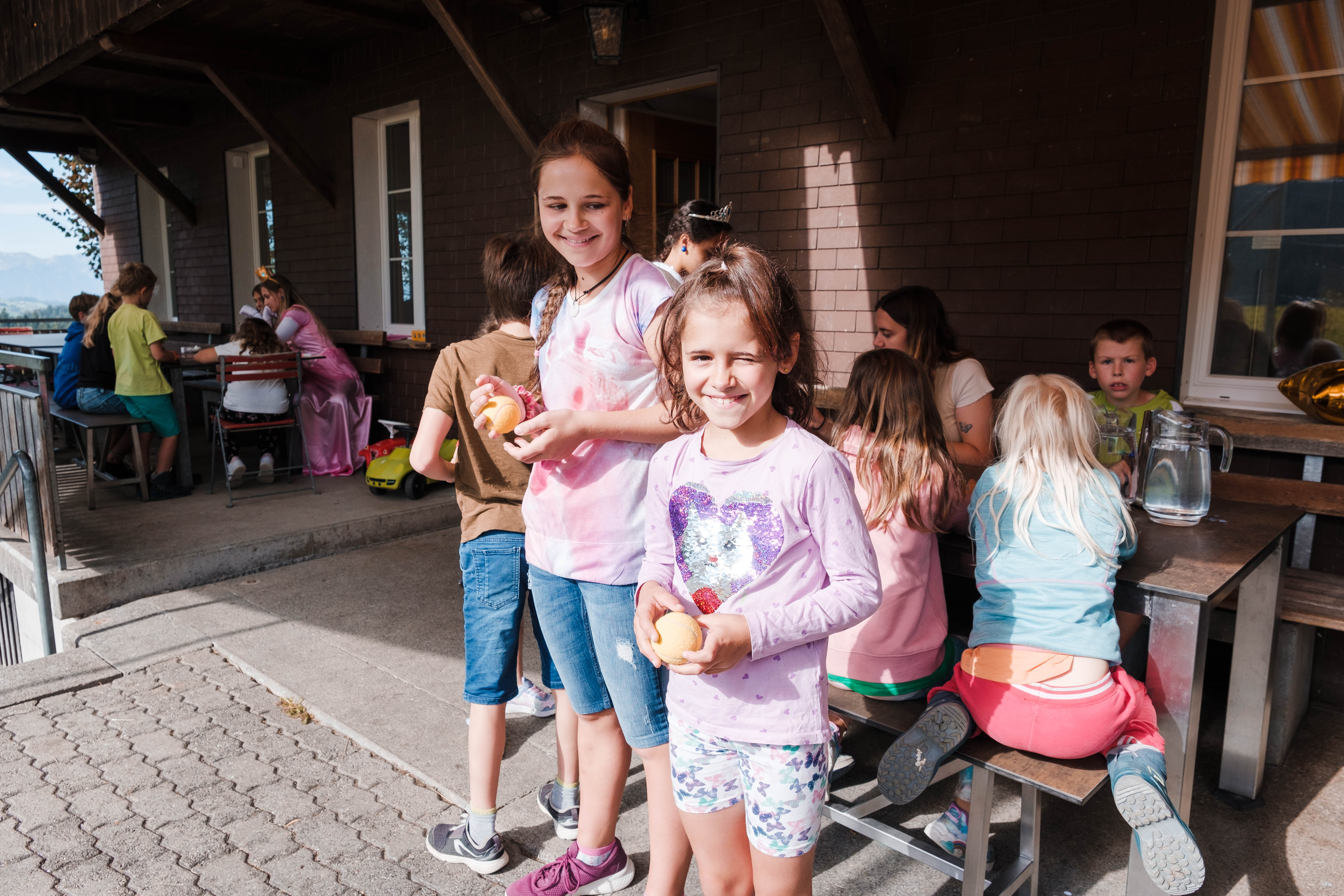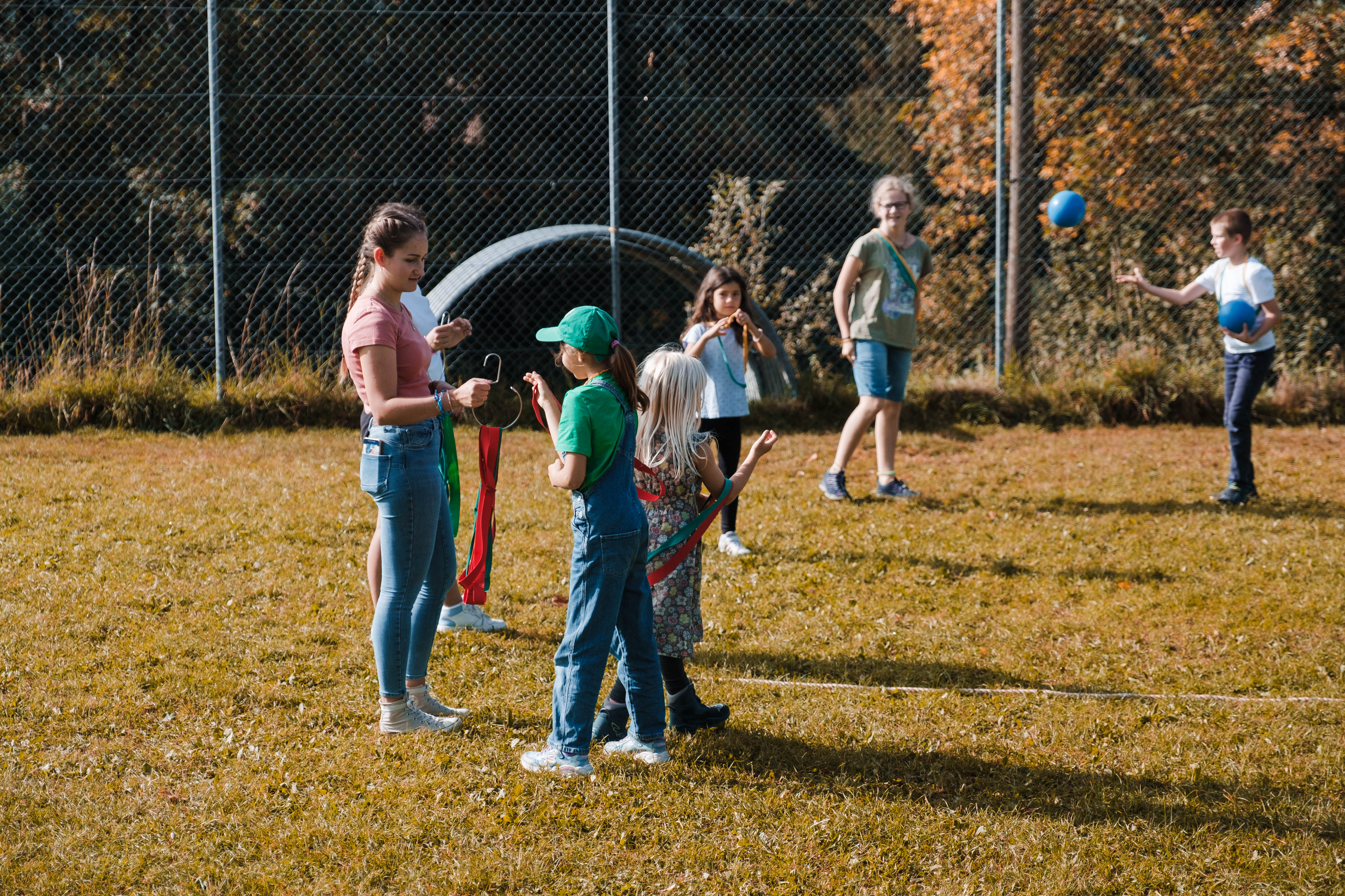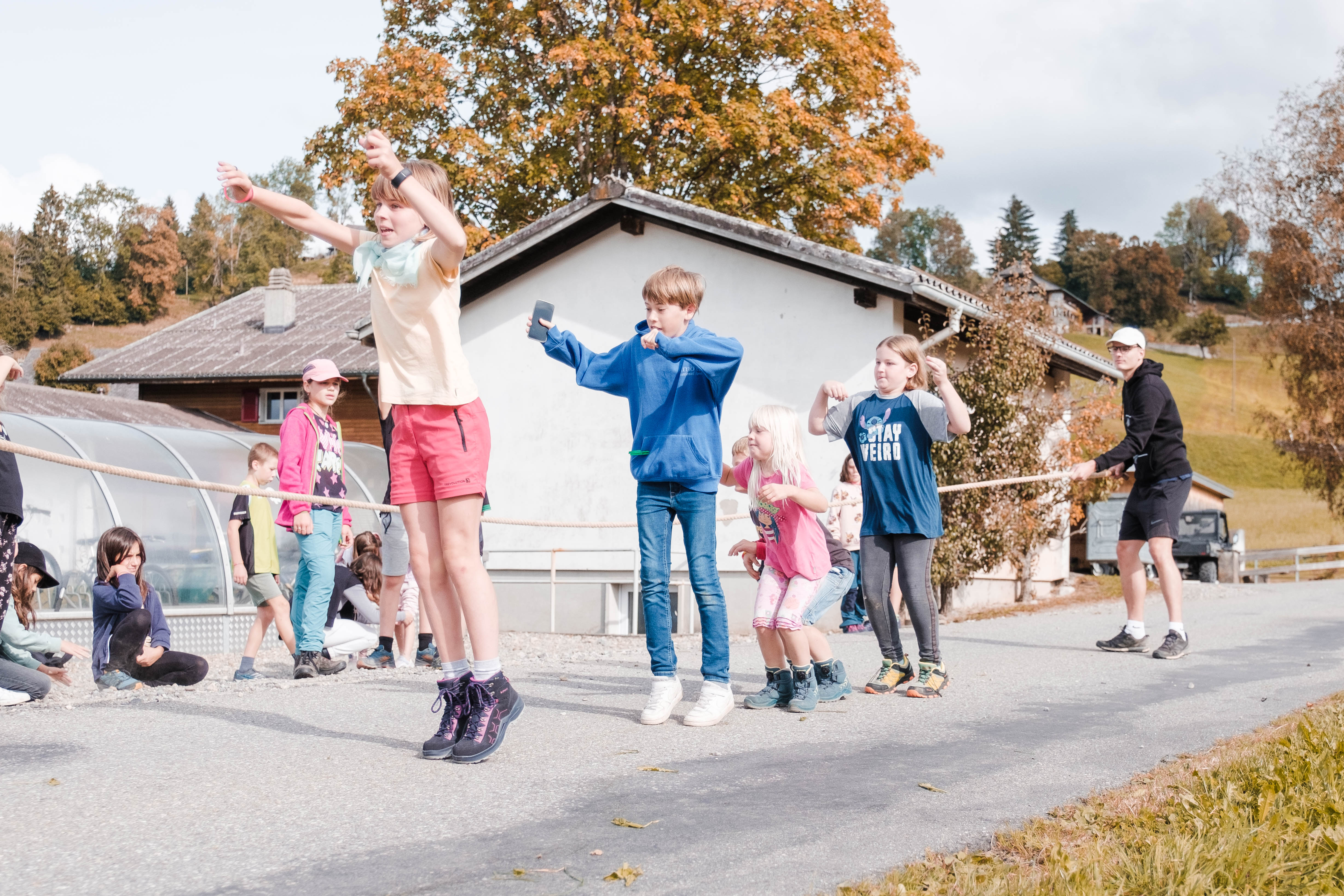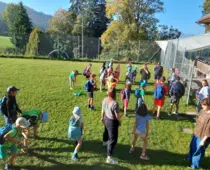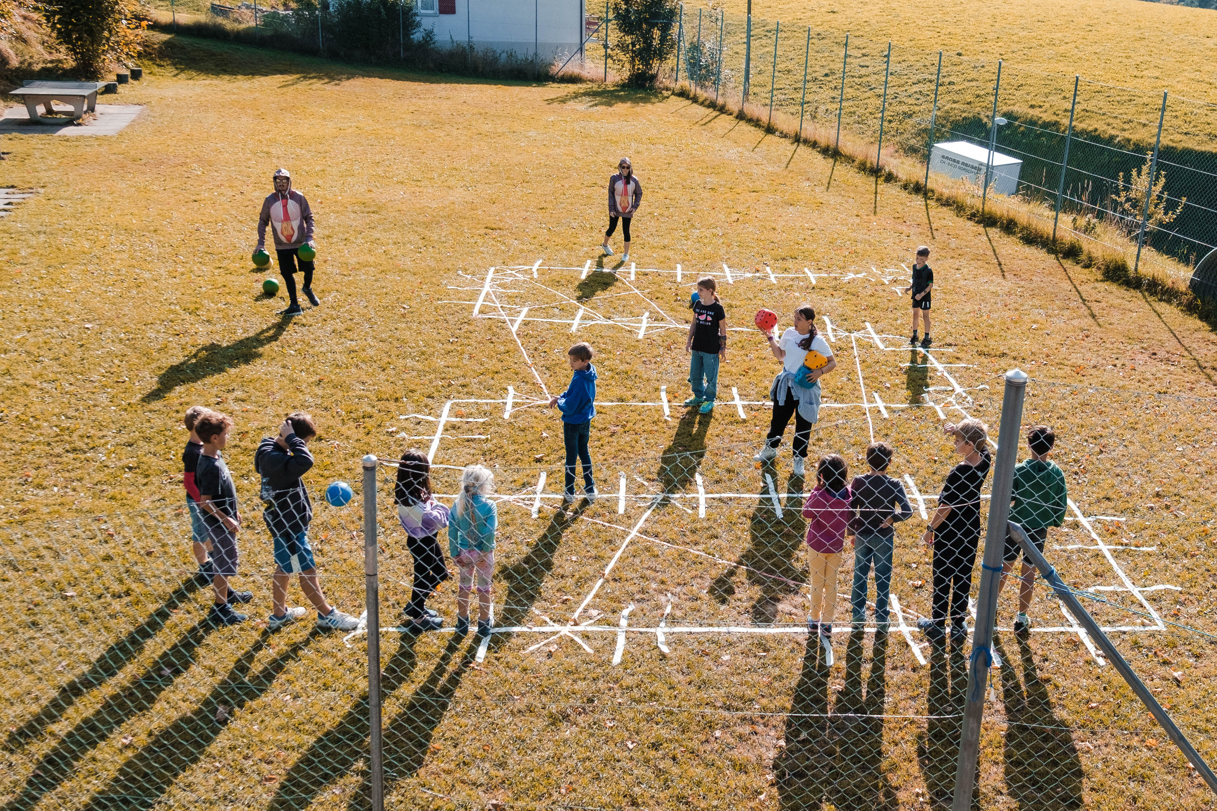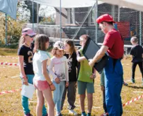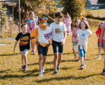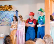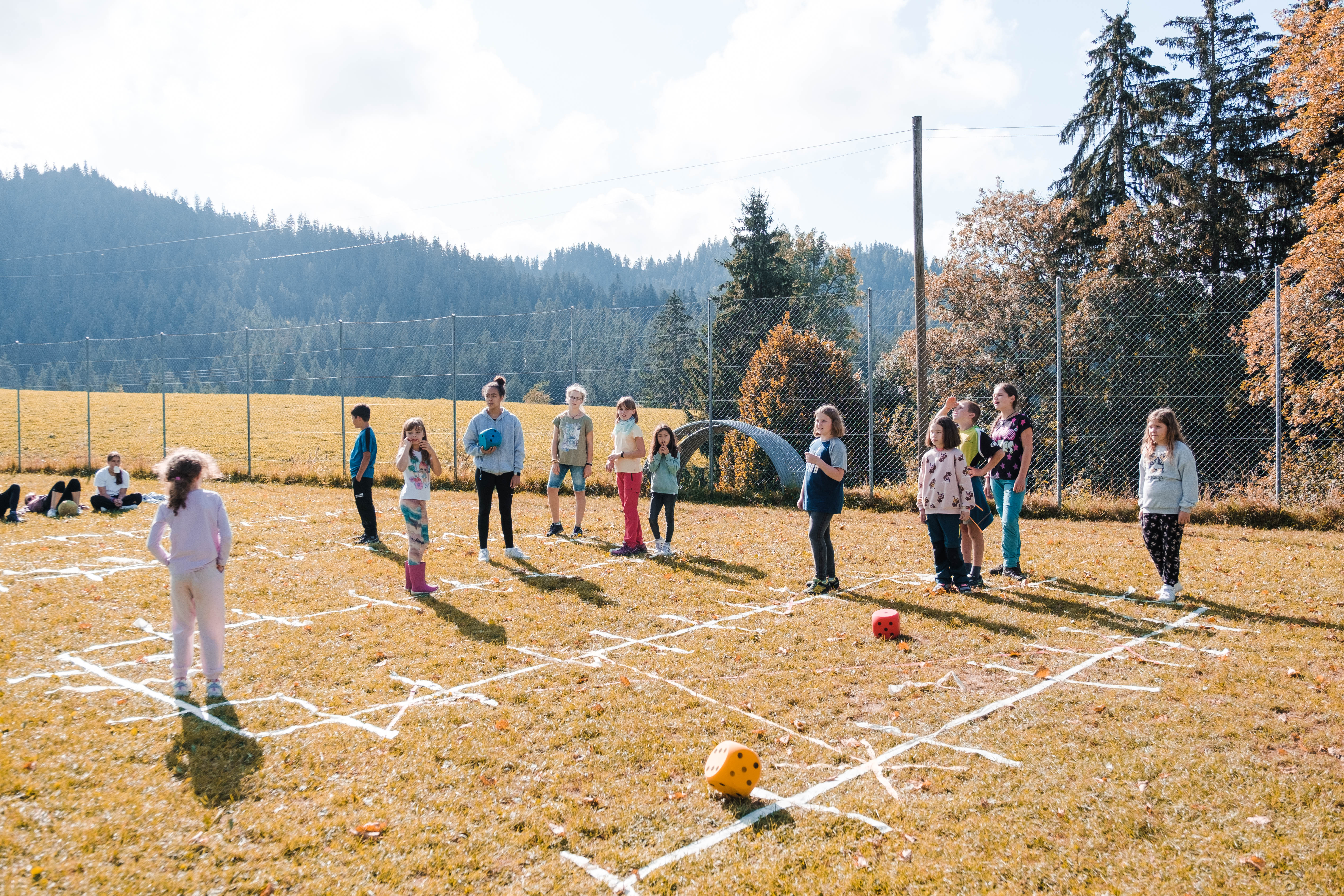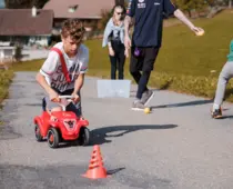 Am Morgen war jedoch erstmal freies Spiel angesagt. Die Kinder durften die Zeit für sich nutzen, einige übten bereits fleissig für den bunten Abend. Zum Z'mittag gab es feine Lasagne; das perfekte Gericht für den bevorstehenden Endkampf. Dieser fand wenige Stunden später auf der grossen Spielwiese statt. Es handelt sich um ein XXL Monopoly Geländespiel, jedoch in abgeänderter Form. Während die vier Teams der Kinder klassisch Strassen kaufen und vervollständigen können, kann Bowser diese Felder verändern. So erscheint auf einem Feld plötzlich die fleischfressende Pflanze oder ein Kettenhund, welche den Kindern die Münzen stehlen. Oder ein Team muss eine ganze Runde für Bowser spielen, und die gesamten Einnahmen an ihn überreichen. Schnell verstanden die Kids, dass sie zwar in vier Gruppen eingeteilt wurden, allerdings zusammenspielen und verhandeln müssen, um den gemeinsamen Feind Bowser zu besiegen. Indem die Teams schlau verhandelten und gezielt ihre Häuser bauten, konnte der Münzbestand von Bowser immer schneller abgebaut werden. Nach einer Stunde war dieser völlig bankrott und musste sich geschlagen geben. Der Jubel war gross und die gesamten Super Mario Figuren waren unendlich dankbar.