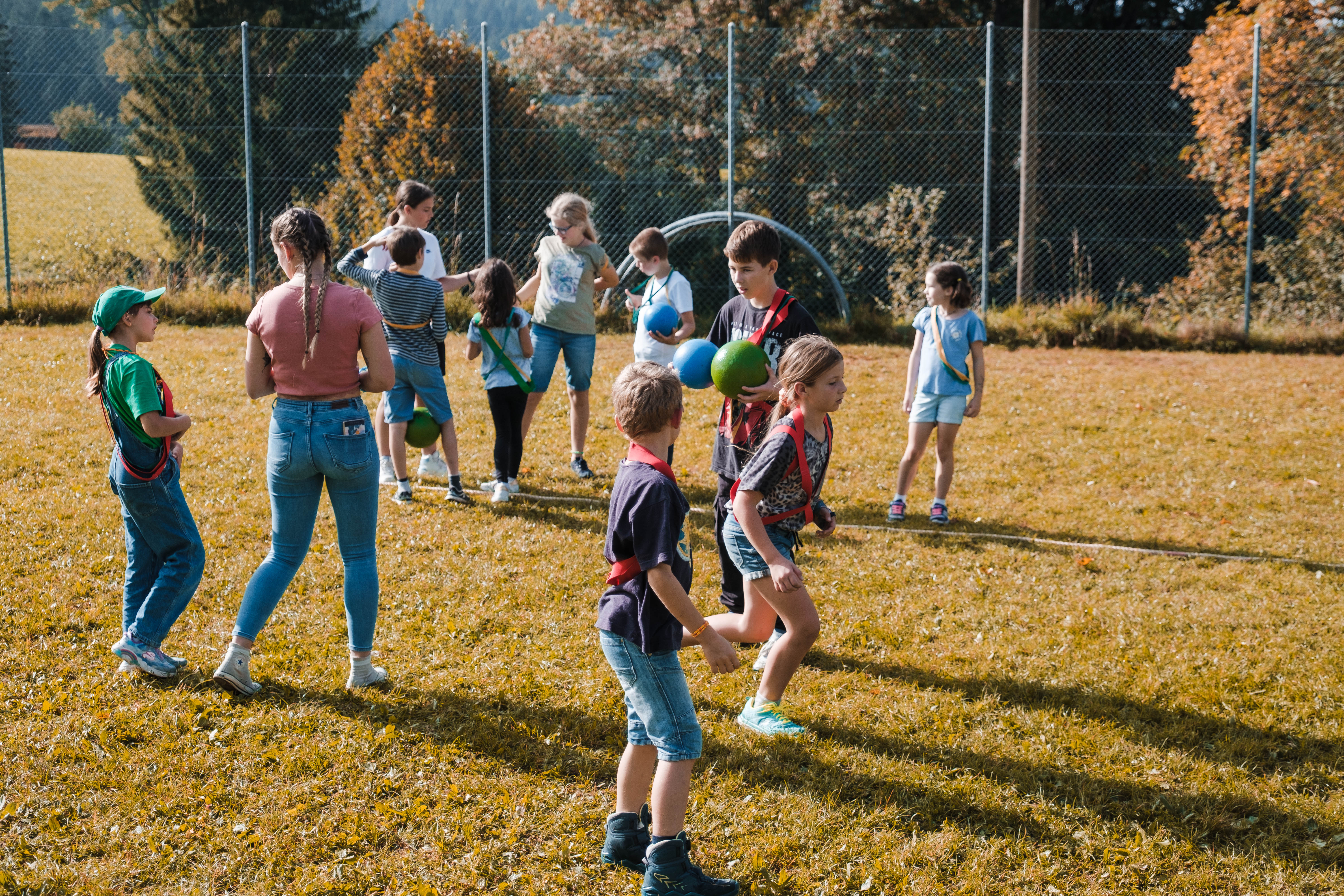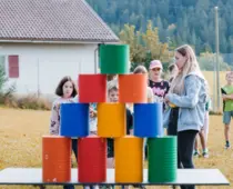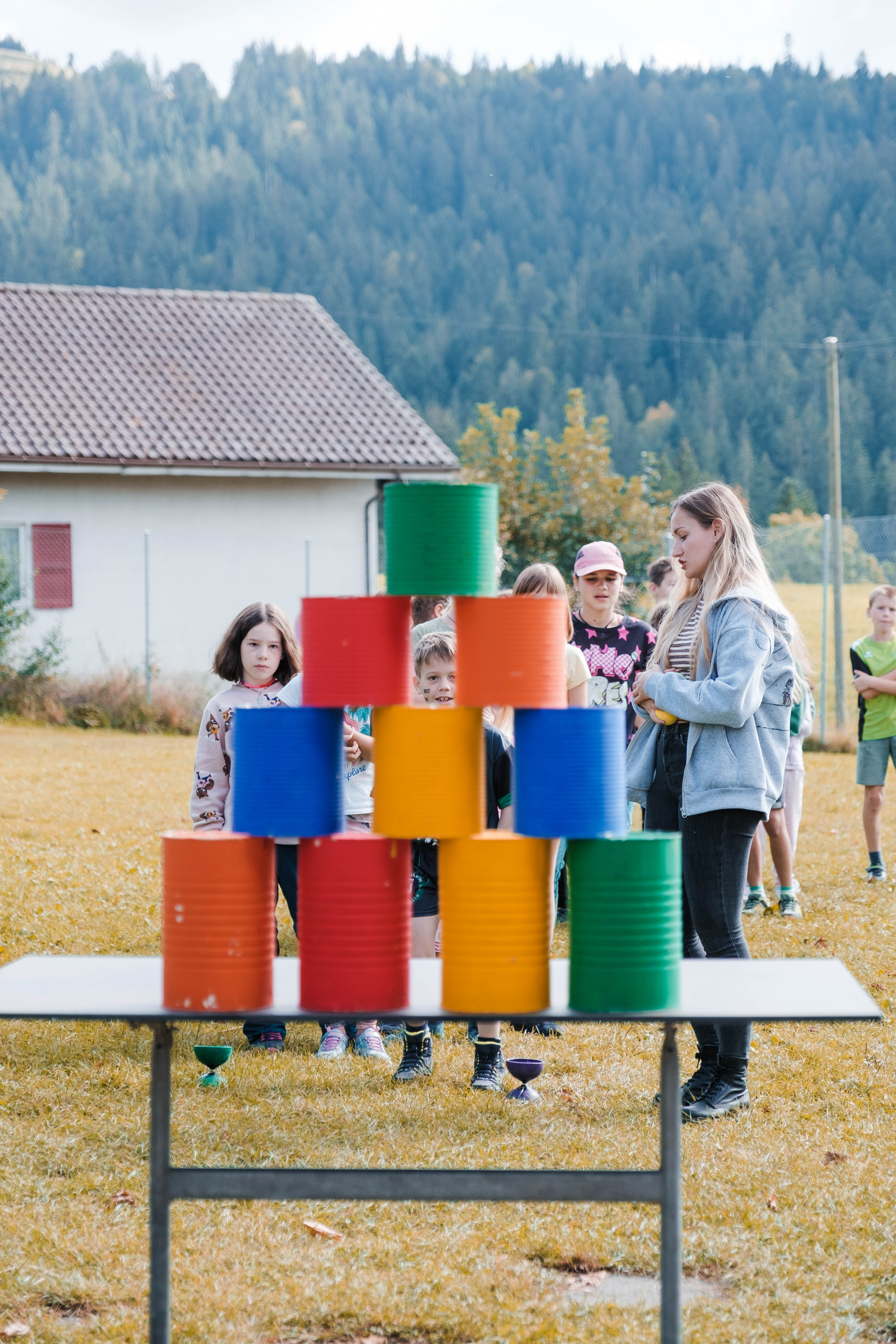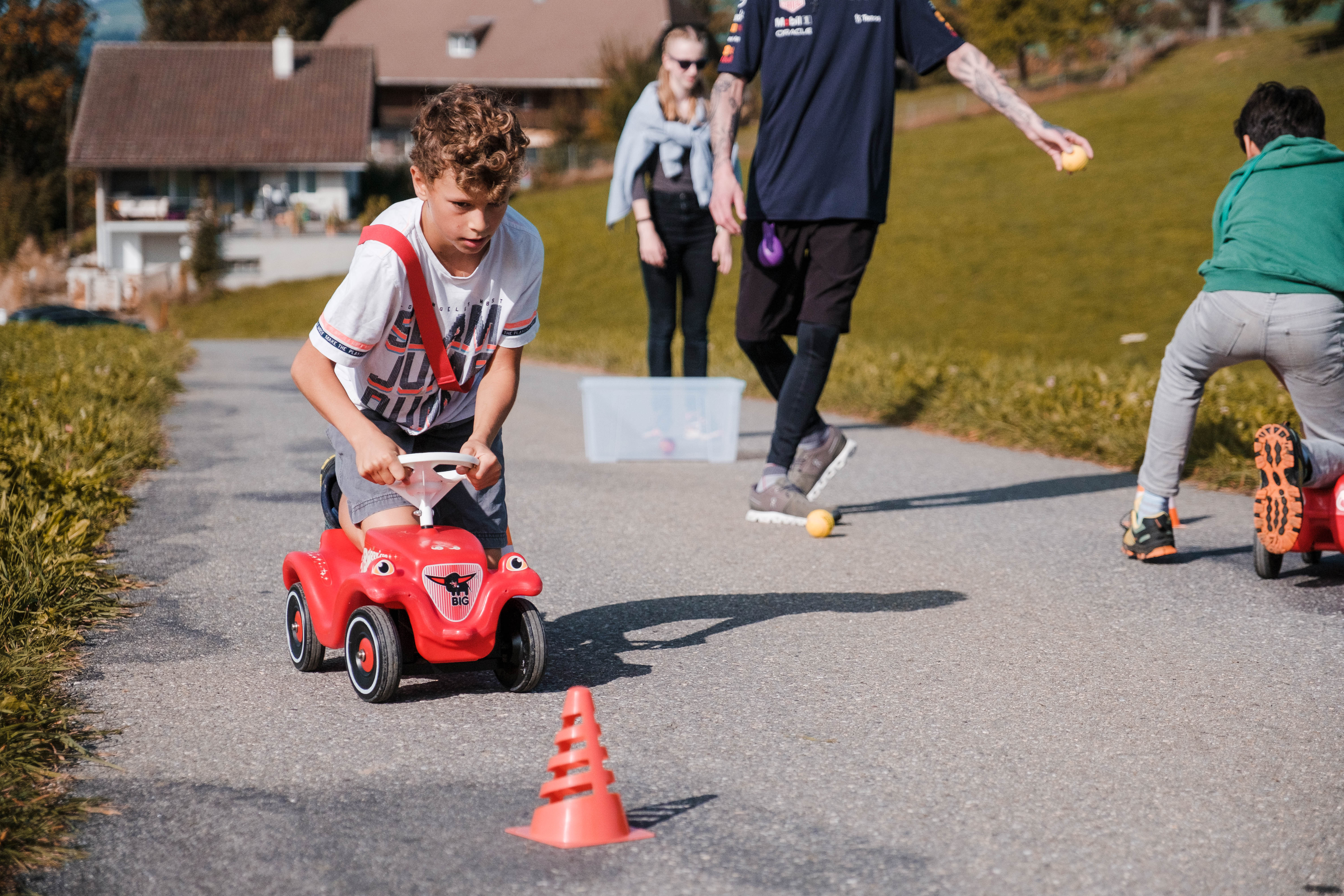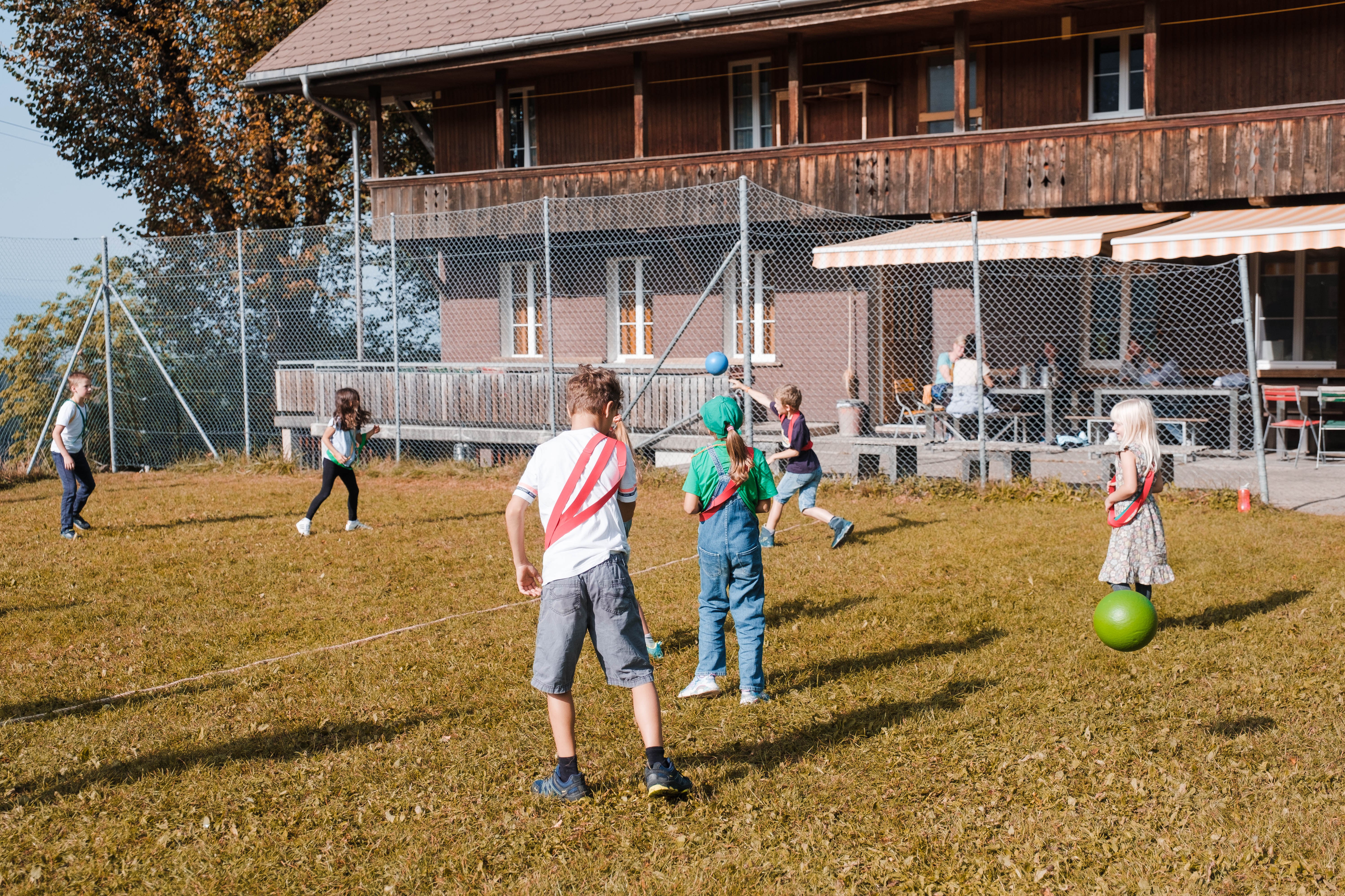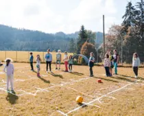 Am Morgen war jedoch erstmal freies Spiel angesagt. Die Kinder durften die Zeit für sich nutzen, einige übten bereits fleissig für den bunten Abend. Zum Z'mittag gab es feine Lasagne; das perfekte Gericht für den bevorstehenden Endkampf. Dieser fand wenige Stunden später auf der grossen Spielwiese statt. Es handelt sich um ein XXL Monopoly Geländespiel, jedoch in abgeänderter Form. Während die vier Teams der Kinder klassisch Strassen kaufen und vervollständigen können, kann Bowser diese Felder verändern. So erscheint auf einem Feld plötzlich die fleischfressende Pflanze oder ein Kettenhund, welche den Kindern die Münzen stehlen. Oder ein Team muss eine ganze Runde für Bowser spielen, und die gesamten Einnahmen an ihn überreichen. Schnell verstanden die Kids, dass sie zwar in vier Gruppen eingeteilt wurden, allerdings zusammenspielen und verhandeln müssen, um den gemeinsamen Feind Bowser zu besiegen. Indem die Teams schlau verhandelten und gezielt ihre Häuser bauten, konnte der Münzbestand von Bowser immer schneller abgebaut werden. Nach einer Stunde war dieser völlig bankrott und musste sich geschlagen geben. Der Jubel war gross und die gesamten Super Mario Figuren waren unendlich dankbar.