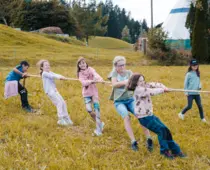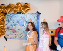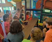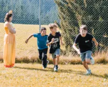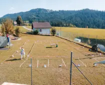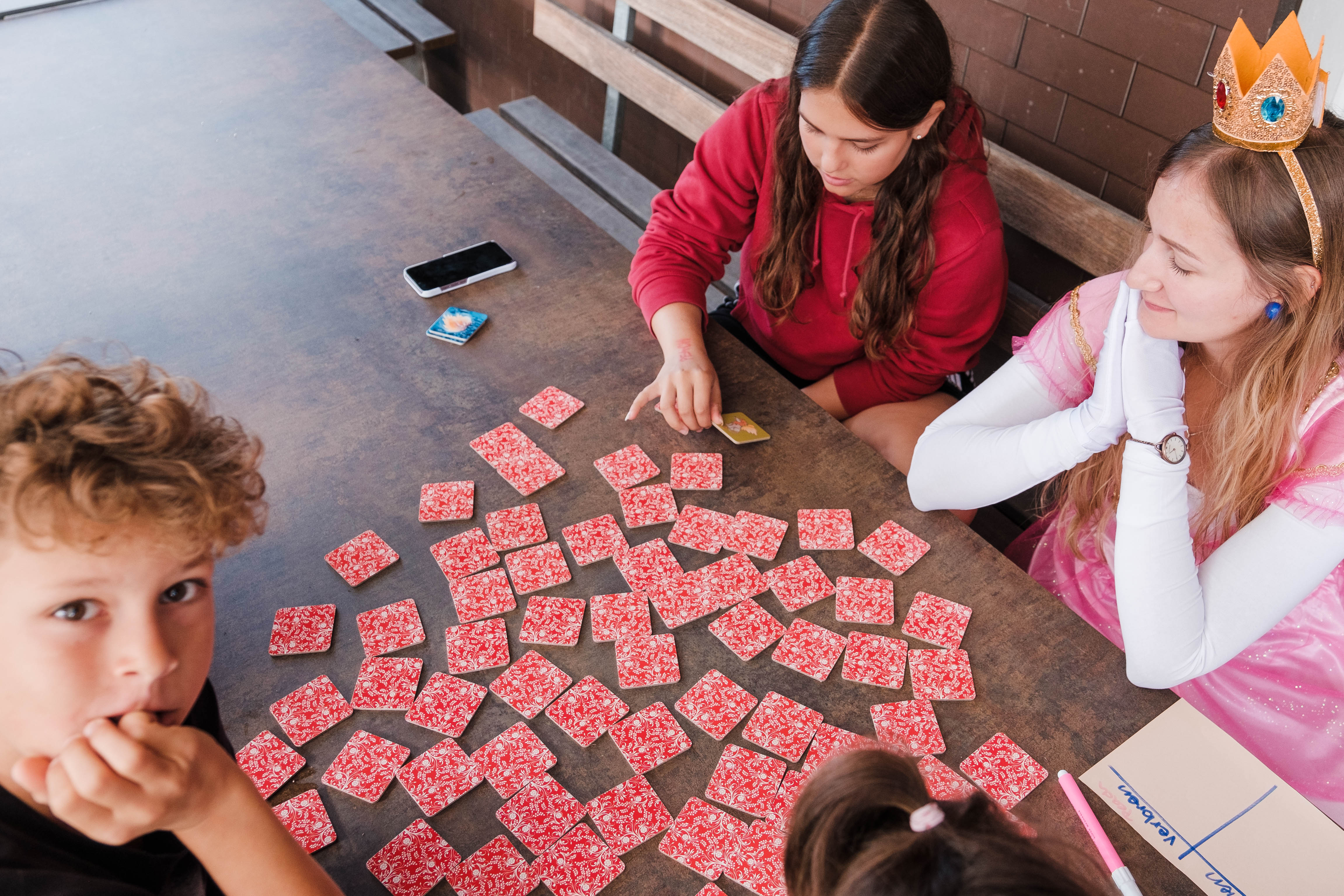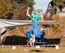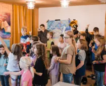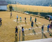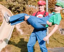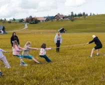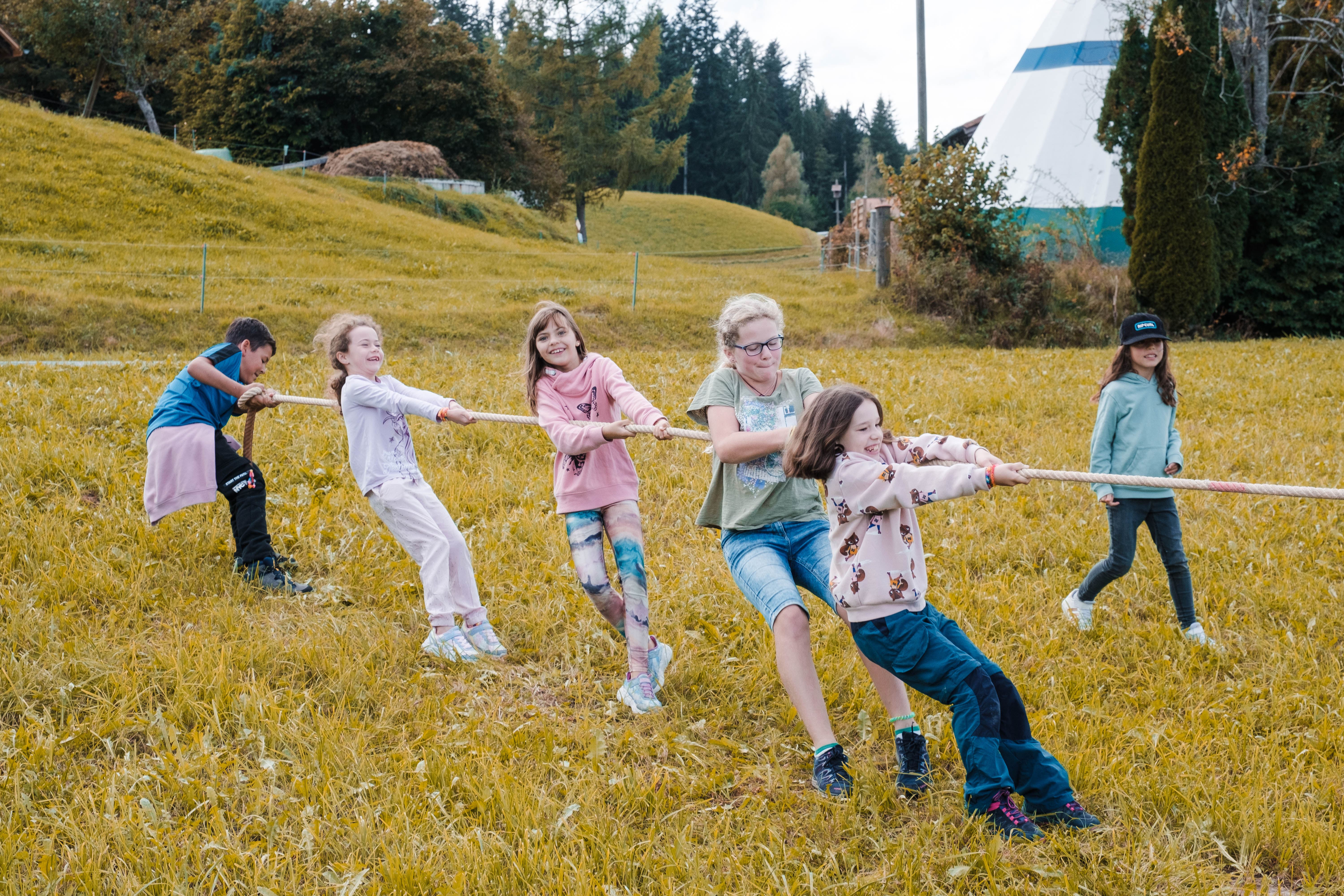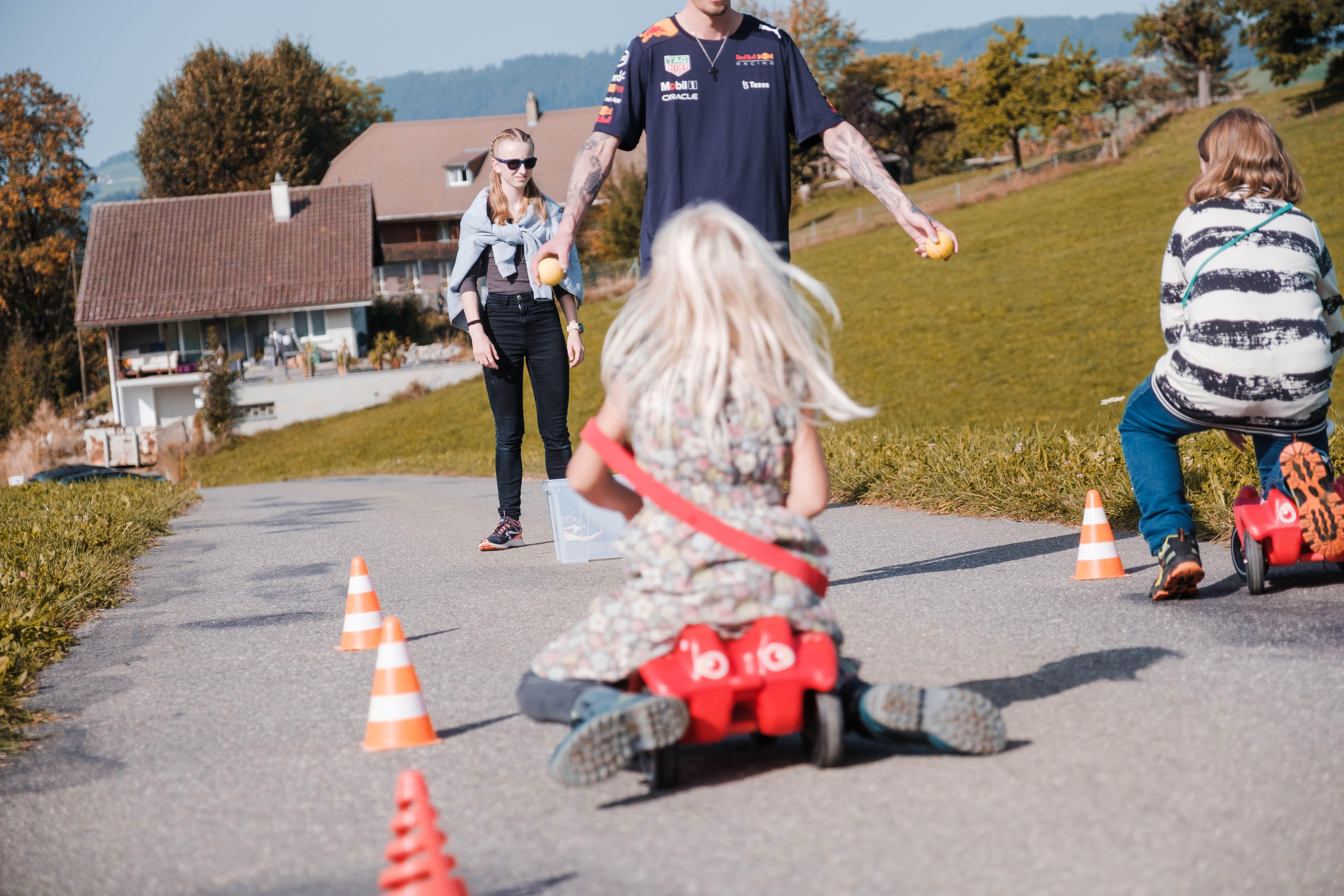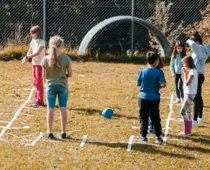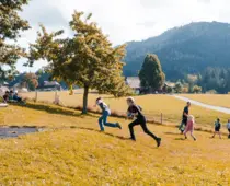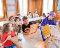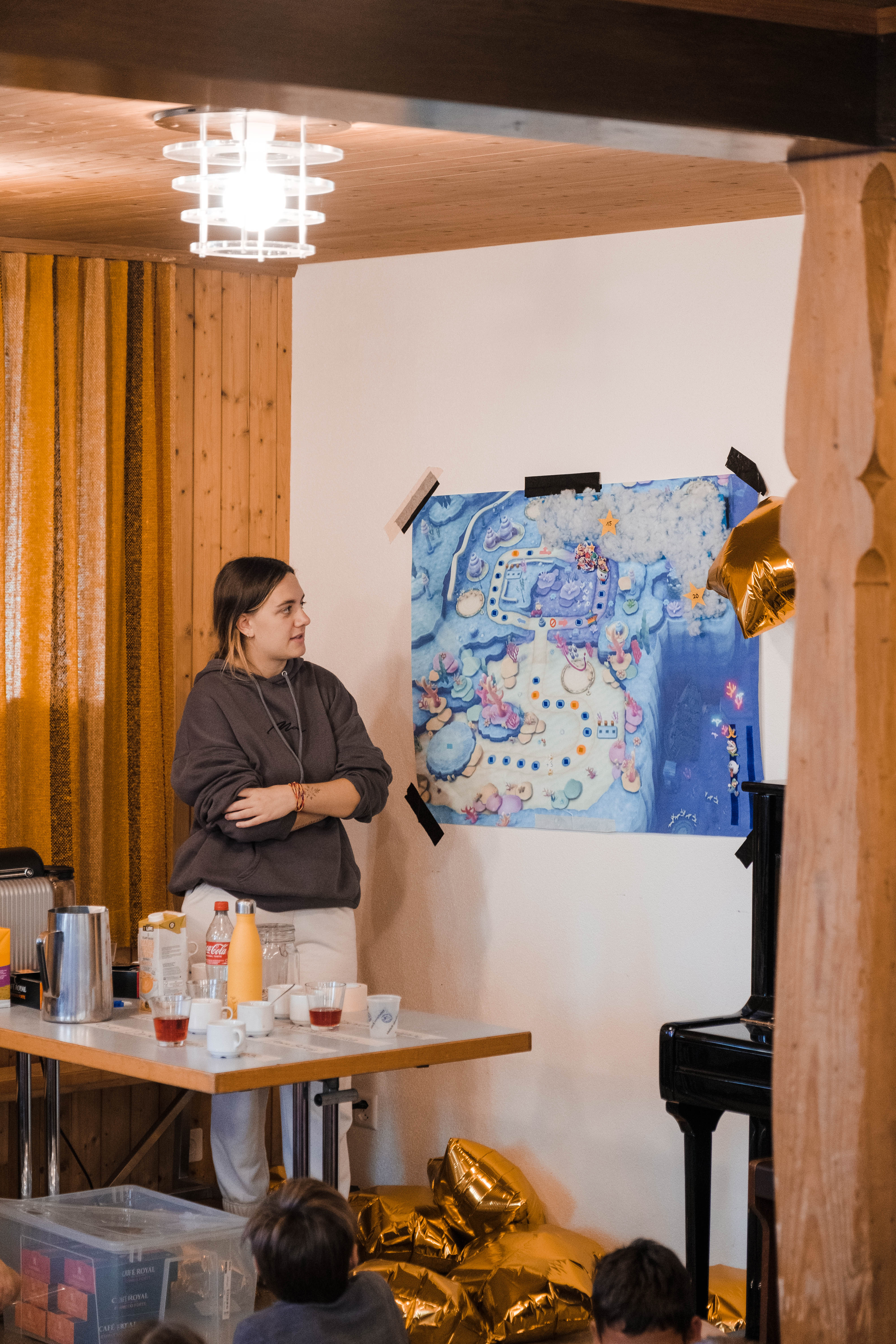 Am Morgen war jedoch erstmal freies Spiel angesagt. Die Kinder durften die Zeit für sich nutzen, einige übten bereits fleissig für den bunten Abend. Zum Z'mittag gab es feine Lasagne; das perfekte Gericht für den bevorstehenden Endkampf. Dieser fand wenige Stunden später auf der grossen Spielwiese statt. Es handelt sich um ein XXL Monopoly Geländespiel, jedoch in abgeänderter Form. Während die vier Teams der Kinder klassisch Strassen kaufen und vervollständigen können, kann Bowser diese Felder verändern. So erscheint auf einem Feld plötzlich die fleischfressende Pflanze oder ein Kettenhund, welche den Kindern die Münzen stehlen. Oder ein Team muss eine ganze Runde für Bowser spielen, und die gesamten Einnahmen an ihn überreichen. Schnell verstanden die Kids, dass sie zwar in vier Gruppen eingeteilt wurden, allerdings zusammenspielen und verhandeln müssen, um den gemeinsamen Feind Bowser zu besiegen. Indem die Teams schlau verhandelten und gezielt ihre Häuser bauten, konnte der Münzbestand von Bowser immer schneller abgebaut werden. Nach einer Stunde war dieser völlig bankrott und musste sich geschlagen geben. Der Jubel war gross und die gesamten Super Mario Figuren waren unendlich dankbar.